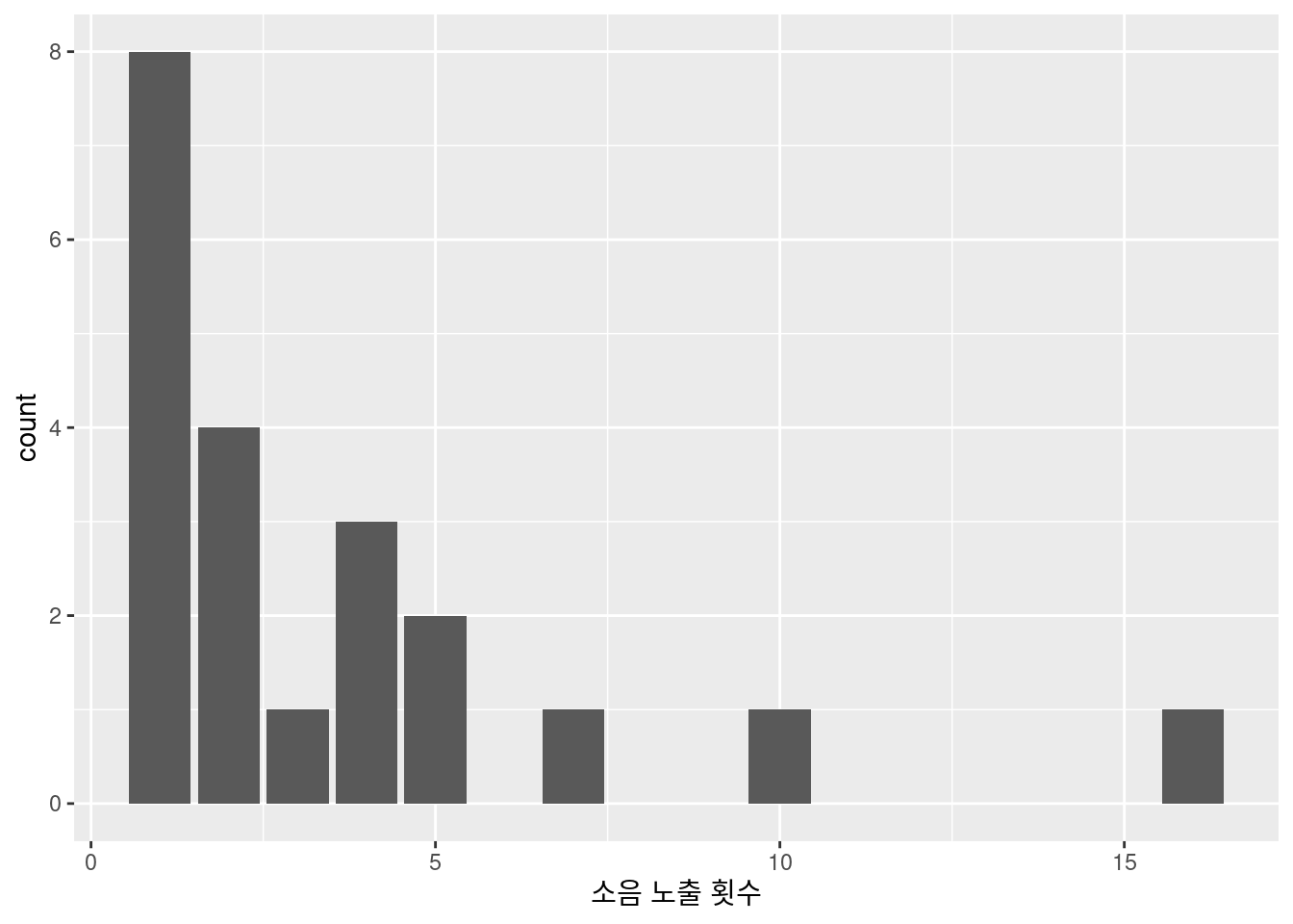 ggplot(aes(x=n)) + geom_bar()를 이용해 그리세요.