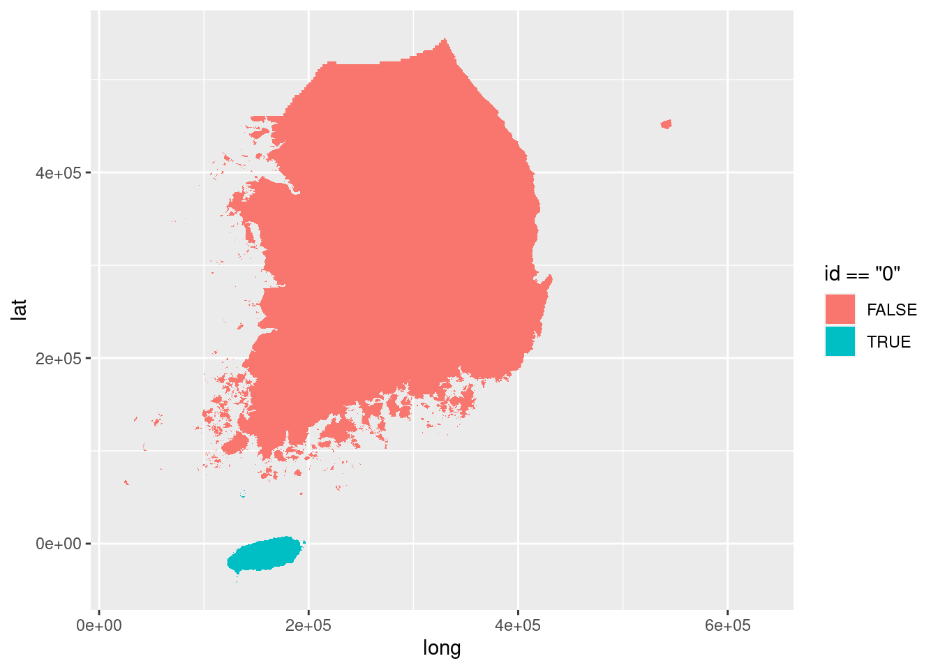 우선 0번은 어느 지역일까요? 아래와 같이하면 0 번은 제주도라는 것을 알 수 있습니다. 여기서 id == '0' 를 통해 알아본 것입니다. id가 0이면 TRUE, 아니면 FALSE라고 인식하게 되므로, TRUE인 파란색이 id ==0 으로 저장되어 있음을 알 수 있습니다.