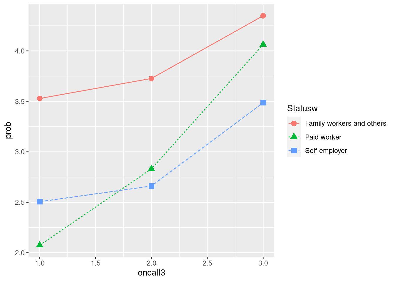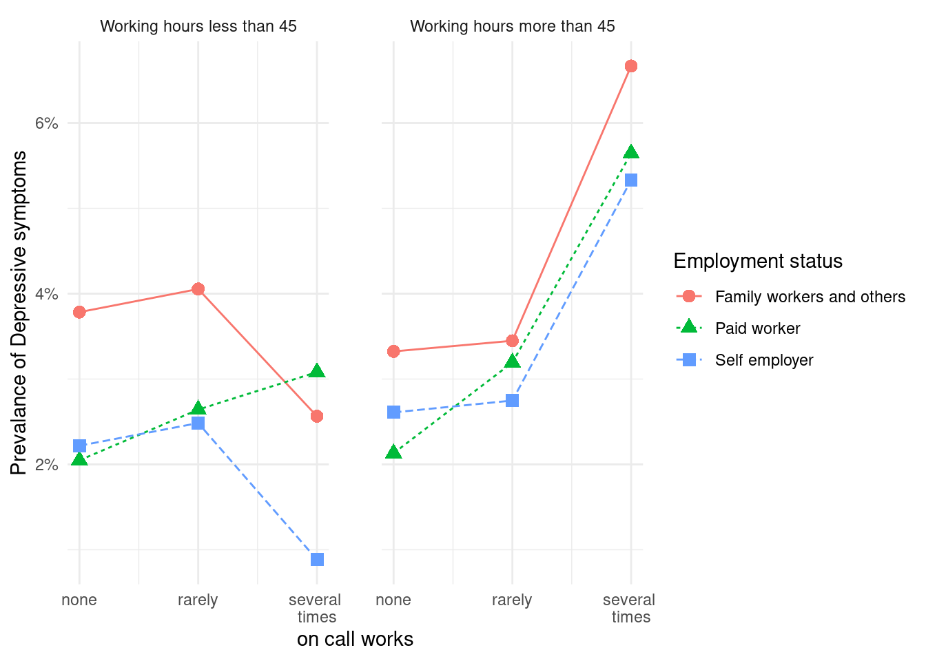 이 데이터를 이용해서 다음과 같은 그래프를 그려보려고 합니다. 저번 시간에 oncall 의 횟수가 늘어나면 우울할 오즈비가 증가하는 것을 표로 나타내었는데요, 그래프를 보면 주 45시간 미만이면서 자영업과 가족종사자에서는 그렇지 않은 반면에, 장시간 근로자에서는 oncall 이 늘어날 수록 우울해 지는 것을 볼 수 있습니다. 왜 그럴까요? 라는 질문이 저절로 나오게 됩니다. 이처럼 그래프를 통해 변화되는 양상을 보여주는 것은 데이터의 속성을 탐구하게 만드는 원동력이 되고는 합니다. 따라서 데이터를 탐구할 때 그래프를 이용해 소통하는 작업을 자주 하는 것이 좋습니다.
