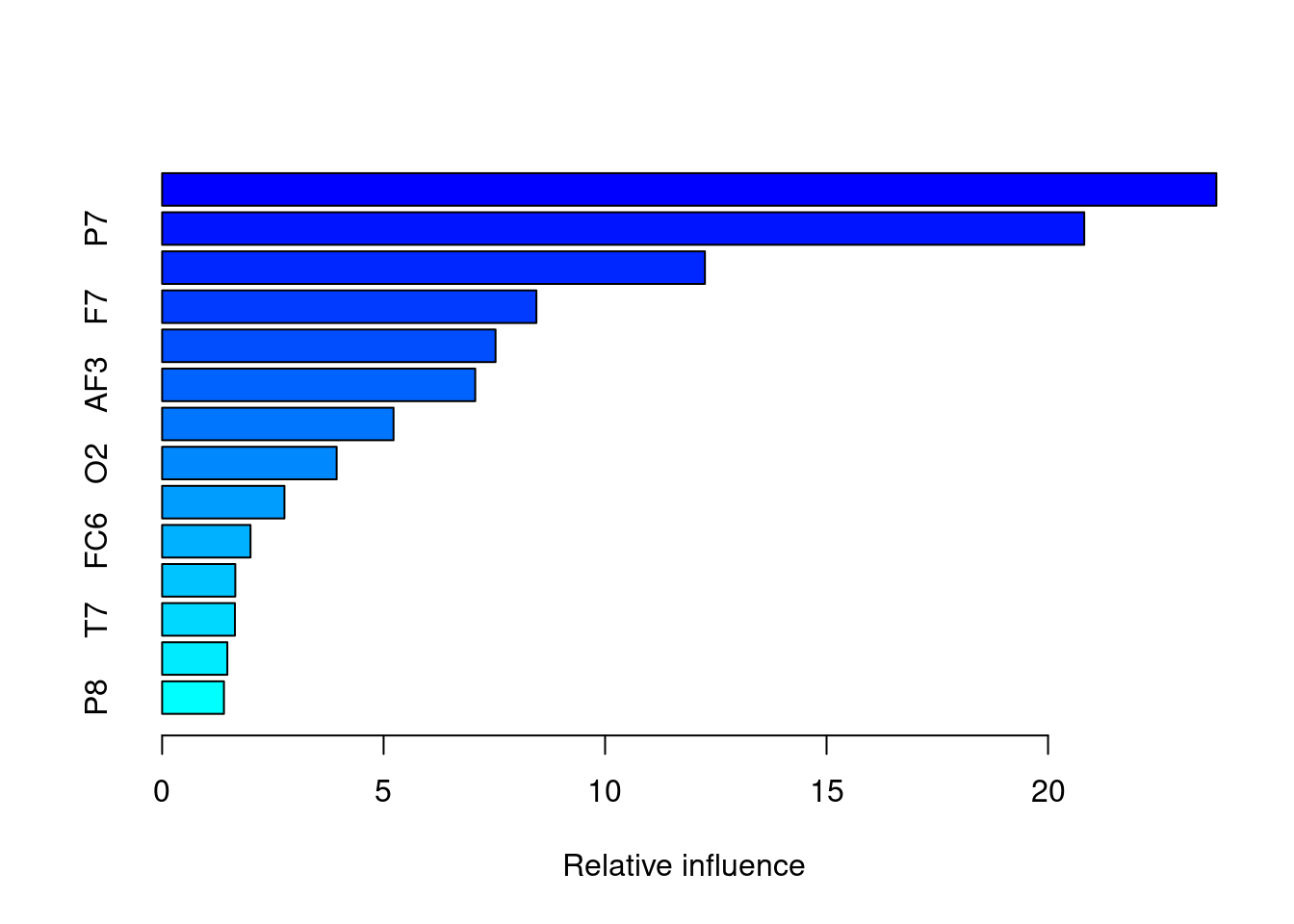 gbmFit3 creates a new summary data set with var, factors in our model, and its relative influence (rel.inf) each variable had on eye opening status. O1 and P7, F8, F7 show highest rel.infs.