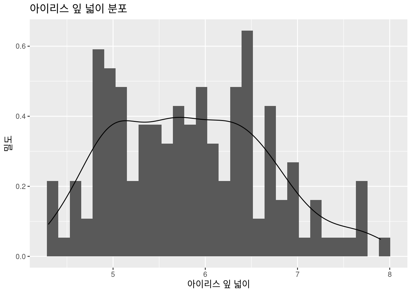ggtitle("아이리스 꽃 별 잎의 길이 분포") +