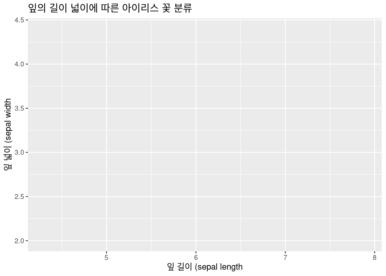 xlab("잎 길이 (sepal length") + ylab("잎 넓이 (sepal width") +