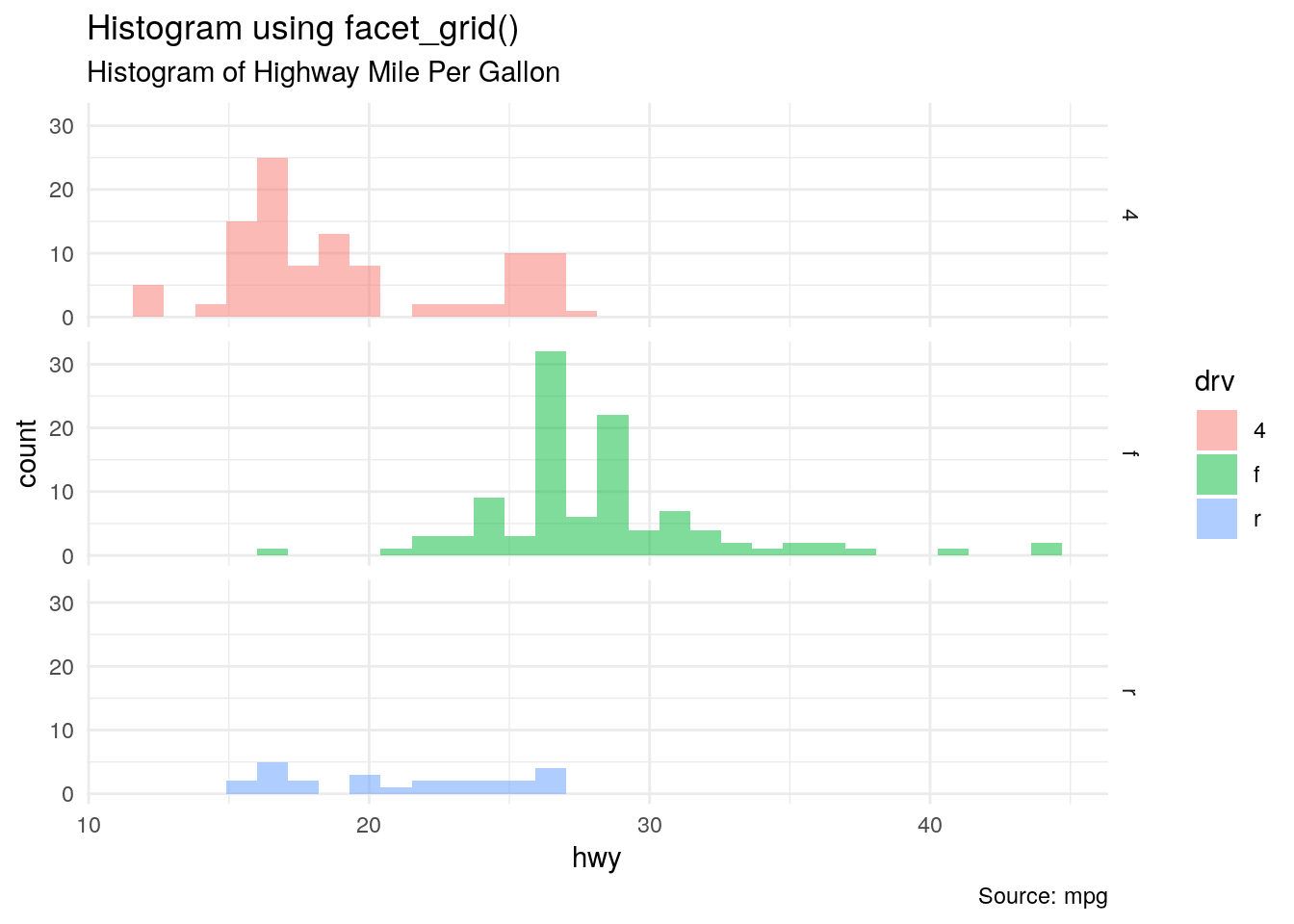 ggplot(data=mpg,aes(x=hwy,fill=drv))+geom_histogram(alpha=0.5)+labs(title="Histogram using facet_grid()",subtitle="Histogram of Highway Mile Per Gallon",color="drv",caption="Source: mpg",x="hwy",y="count")+theme_minimal()+facet_grid(rows=vars(drv))## `stat_bin()` using `bins = 30`. Pick better value with `binwidth`.