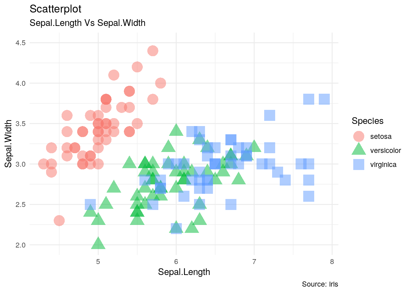 ggplot(data=iris,aes(x=Sepal.Length,y=Sepal.Width,shape=Species,color=Species))+geom_point(size=6,alpha=0.5)+xlim(c(4,8))+scale_x_continuous(breaks=c(5,6,7,8))+ylim(c(2.0,4.5))+labs(title="Scatterplot",subtitle="Sepal.Length Vs Sepal.Width",color="Species",caption="Source: iris")+theme_minimal()## Scale for 'x' is already present. Adding another scale for 'x', which will