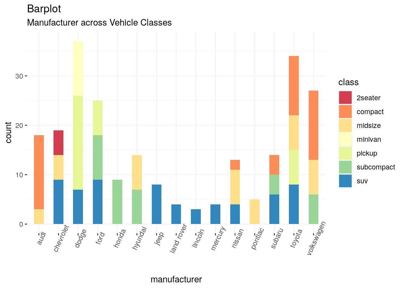 ggplot(data=mpg,aes(x=manufacturer,fill=class))+geom_bar(width=0.5)+theme(panel.background=element_rect(fill = "white"),panel.grid=element_line(colour="grey95",linetype = "solid"),axis.text.x=element_text(angle=65))+scale_fill_brewer(palette="Spectral")+labs(title="Barplot",subtitle = "Manufacturer across Vehicle Classes")