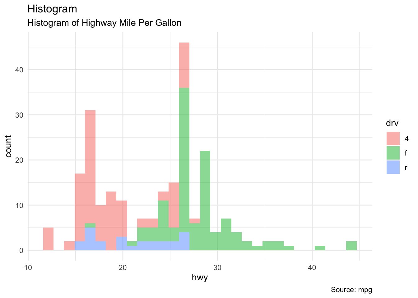 ggplot(data=mpg,aes(x=hwy,fill=drv))+geom_histogram(alpha=0.5)+labs(title="Histogram",subtitle="Histogram of Highway Mile Per Gallon",color="drv",caption="Source: mpg",x="hwy",y="count")+theme_minimal()## `stat_bin()` using `bins = 30`. Pick better value with `binwidth`.