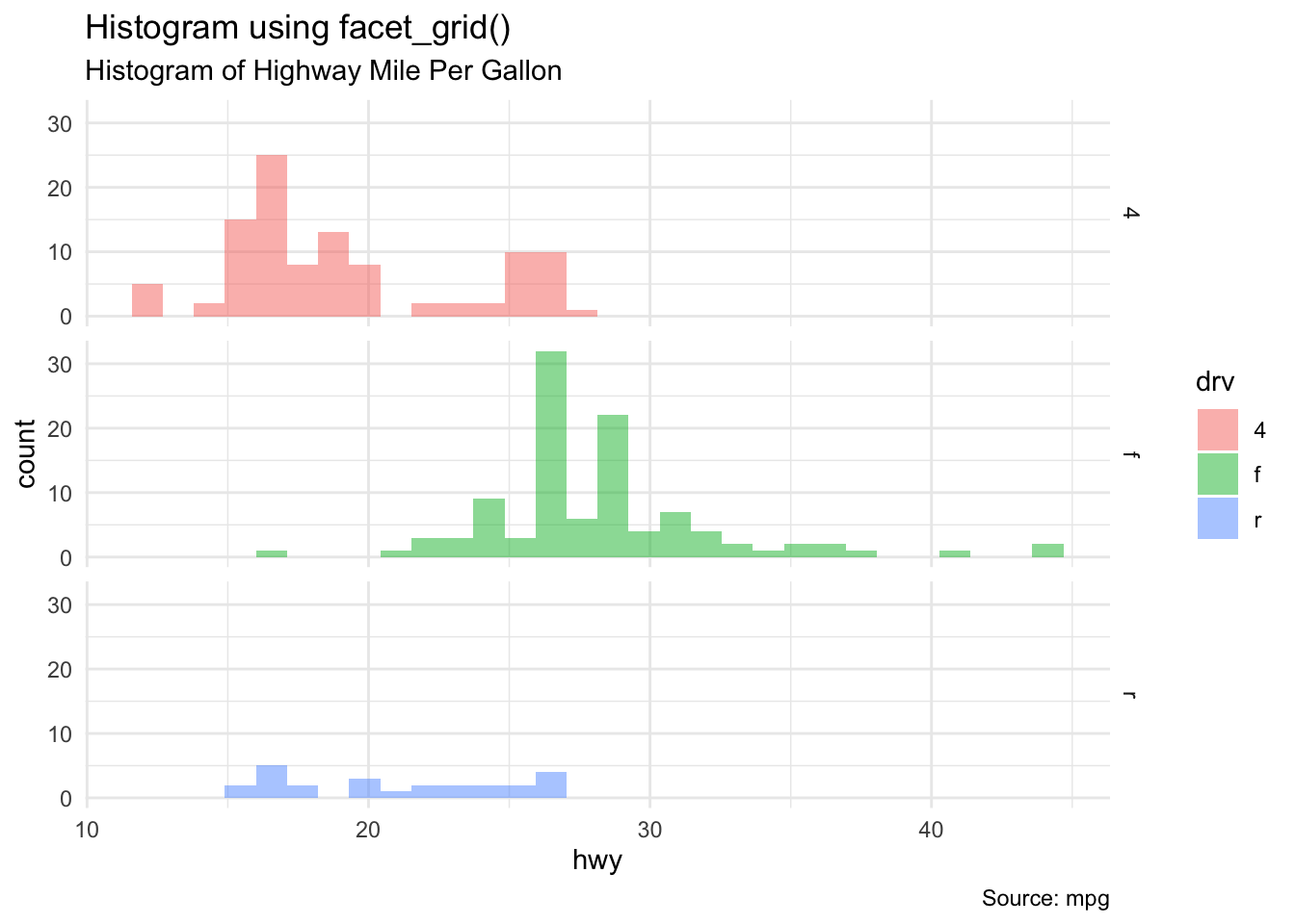 ggplot(data=mpg,aes(x=hwy,fill=drv))+geom_histogram(alpha=0.5)+labs(title="Histogram using facet_grid()",subtitle="Histogram of Highway Mile Per Gallon",color="drv",caption="Source: mpg",x="hwy",y="count")+theme_minimal()+facet_grid(rows=vars(drv))## `stat_bin()` using `bins = 30`. Pick better value with `binwidth`.