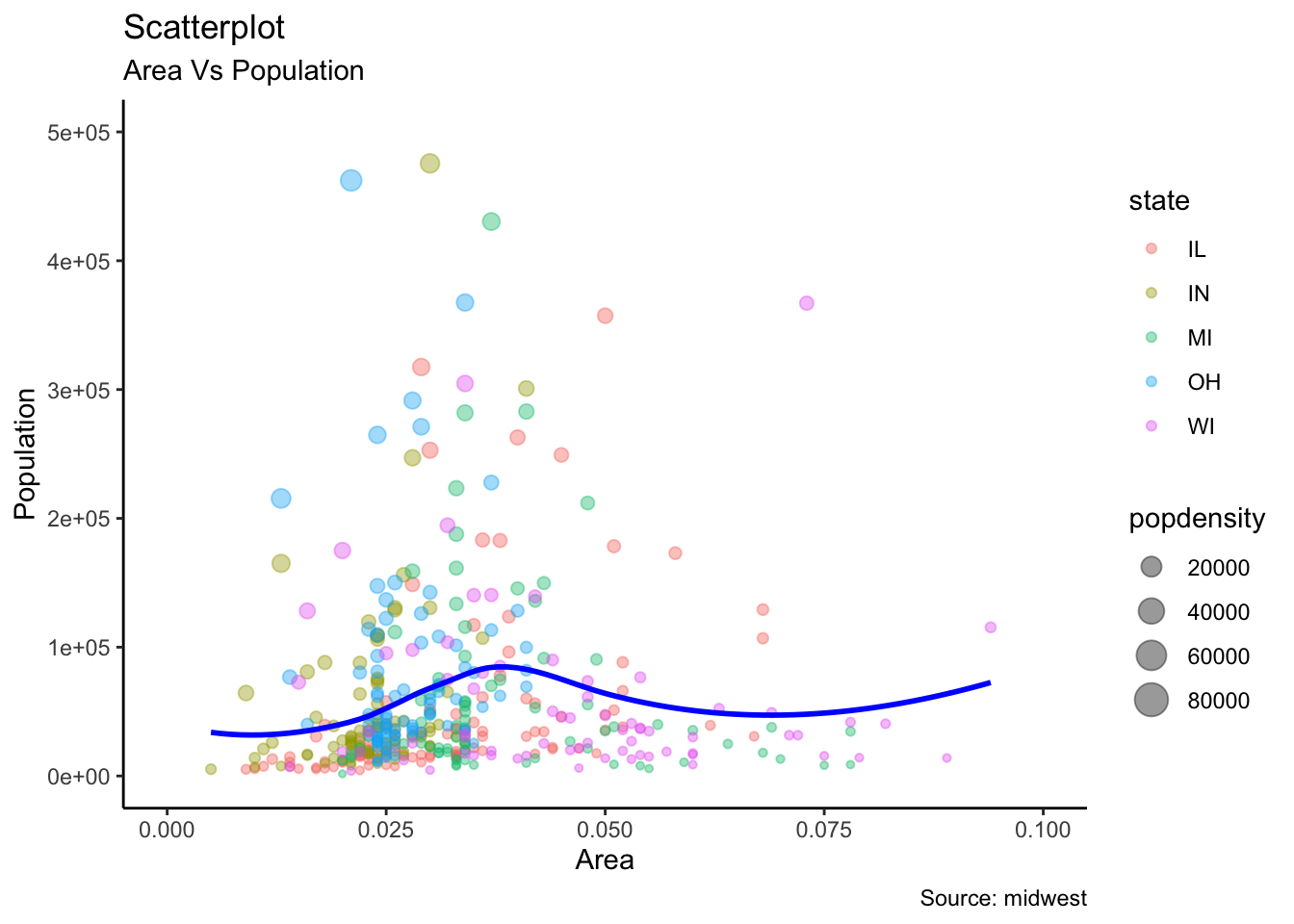 ggplot(data=midwest,aes(x=area,y=poptotal),options(scipen = 999))+geom_point(alpha=0.4,aes(color=state,size=popdensity))+geom_smooth(color="blue",alpha=0.4,se=F)+labs(title="Scatterplot",subtitle="Area Vs Population",x="Area",y="Population",color="state",size="popdensity",caption="Source: midwest")+xlim(c(0,0.1))+ylim(c(0,500000))+theme_classic()## `geom_smooth()` using method = 'loess' and formula 'y ~ x'