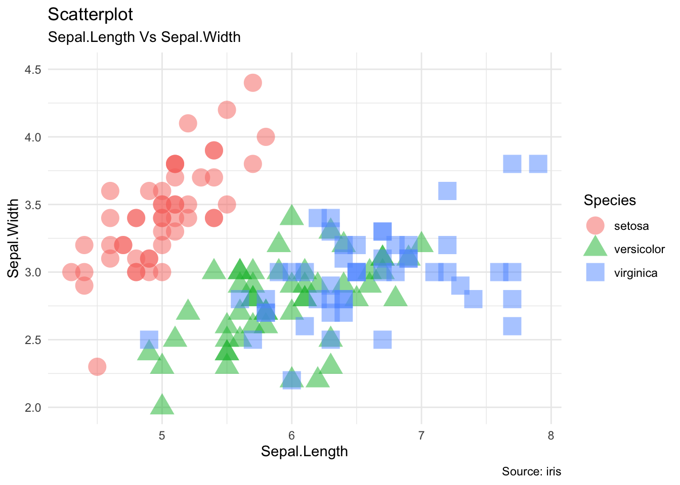 ggplot(data=iris,aes(x=Sepal.Length,y=Sepal.Width,shape=Species,color=Species))+geom_point(size=6,alpha=0.5)+xlim(c(4,8))+scale_x_continuous(breaks=c(5,6,7,8))+ylim(c(2.0,4.5))+labs(title="Scatterplot",subtitle="Sepal.Length Vs Sepal.Width",color="Species",caption="Source: iris")+theme_minimal()## Scale for 'x' is already present. Adding another scale for 'x', which will