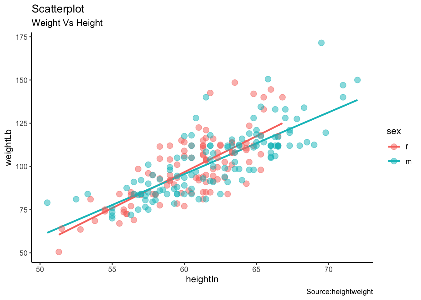 ggplot(data=heightweight,aes(x=heightIn,y=weightLb,color=sex))+geom_smooth(alpha=0.5,method=lm,se=F)+geom_point(alpha=0.5,size=3)+theme_classic()+xlim(c(50,75))+ylim(c(48,176))+scale_x_continuous(breaks=c(50,55,60,65,70))+scale_y_continuous(breaks=c(50,75,100,125,150,175))+labs(title="Scatterplot",subtitle = "Weight Vs Height", caption="Source:heightweight")## Scale for 'x' is already present. Adding another scale for 'x', which will