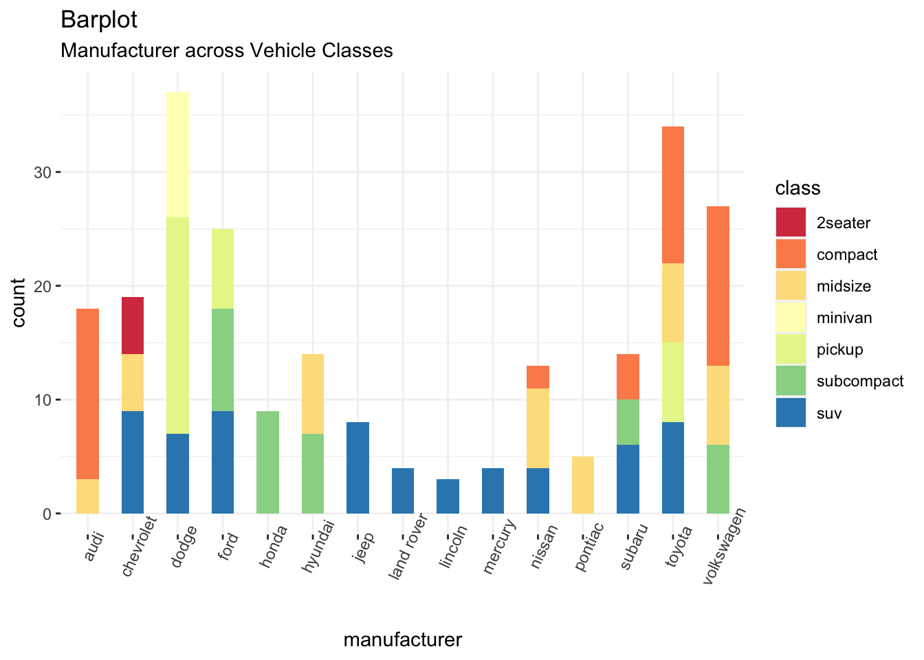 ggplot(data=mpg,aes(x=manufacturer,fill=class))+geom_bar(width=0.5)+theme(panel.background=element_rect(fill = "white"),panel.grid=element_line(colour="grey95",linetype = "solid"),axis.text.x=element_text(angle=65))+scale_fill_brewer(palette="Spectral")+labs(title="Barplot",subtitle = "Manufacturer across Vehicle Classes")
