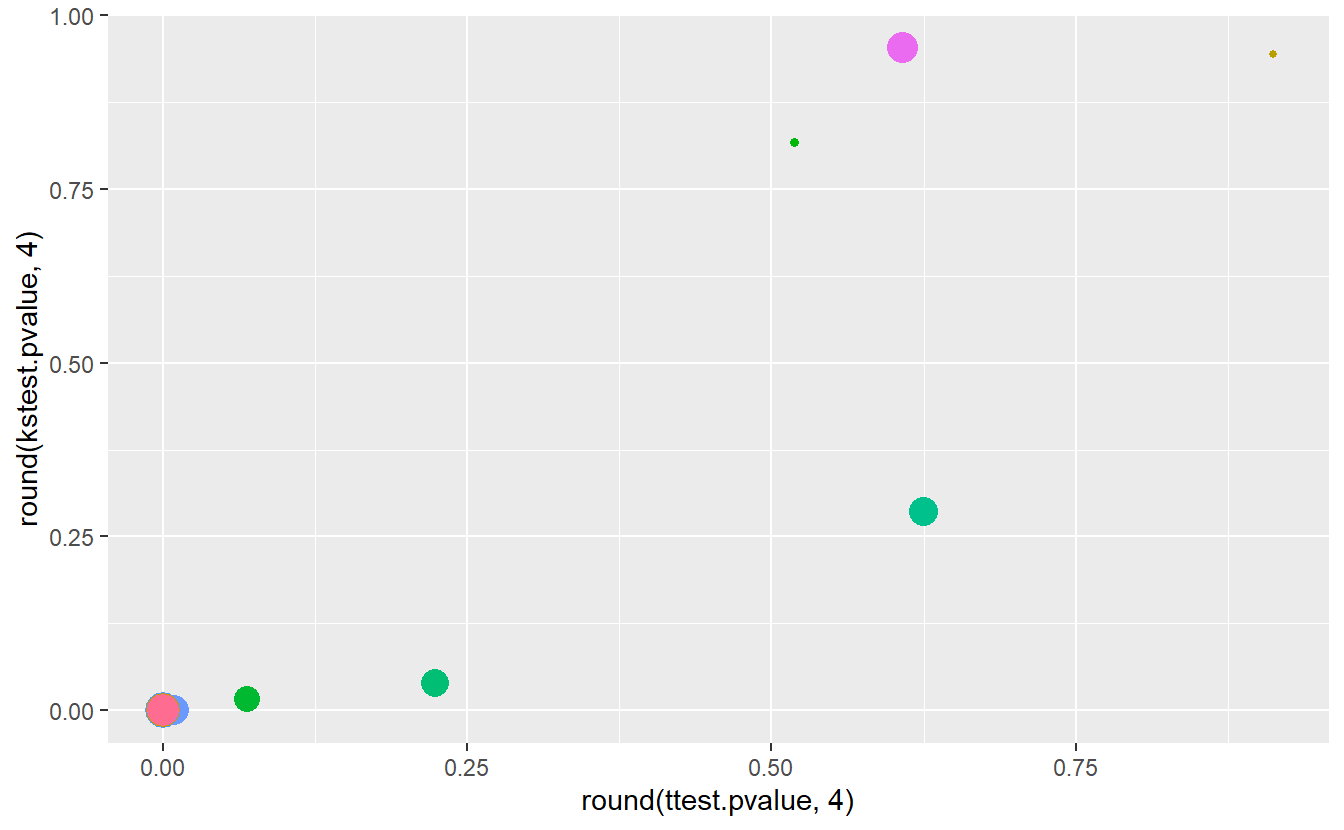 ggplot(aes(x=round(ttest.pvalue,4) , y= round(kstest.pvalue,4), color = Feature, size = Feature_Prevalence_Pct)) +