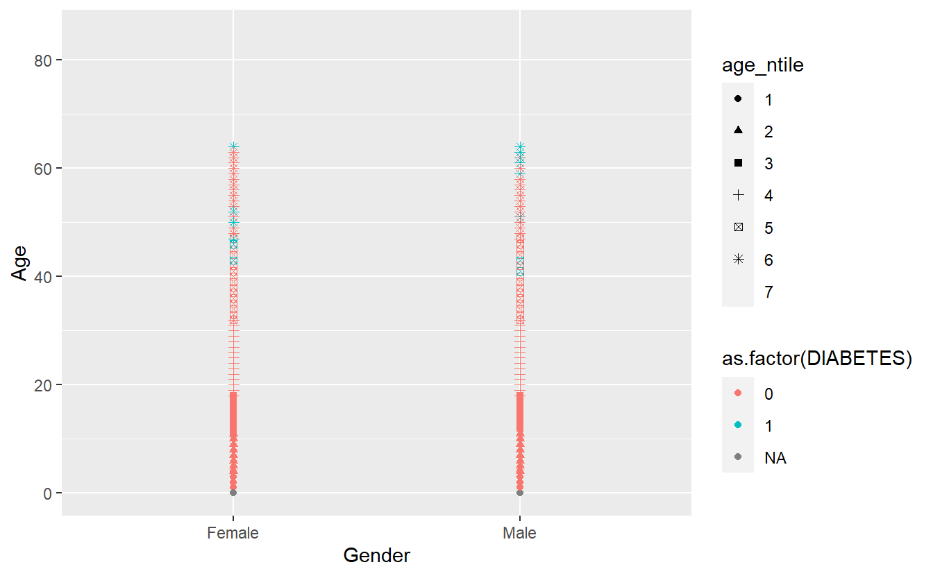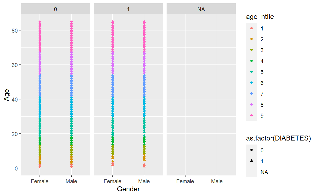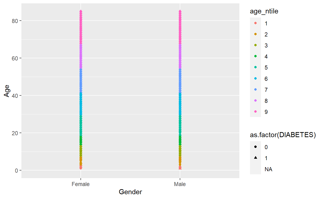 ggplot(aes(x = Gender, y = Age, color = as.factor(DIABETES), shape = age_ntile)) +