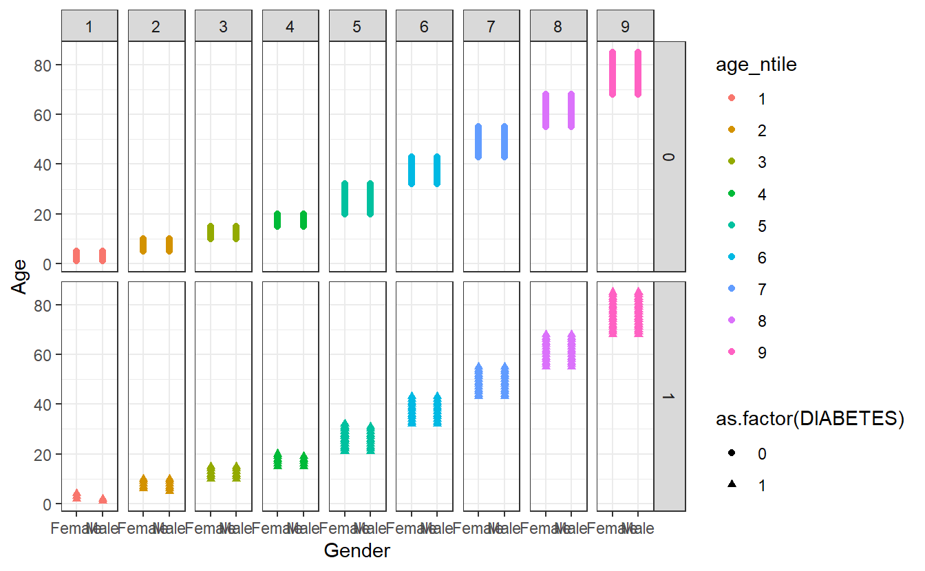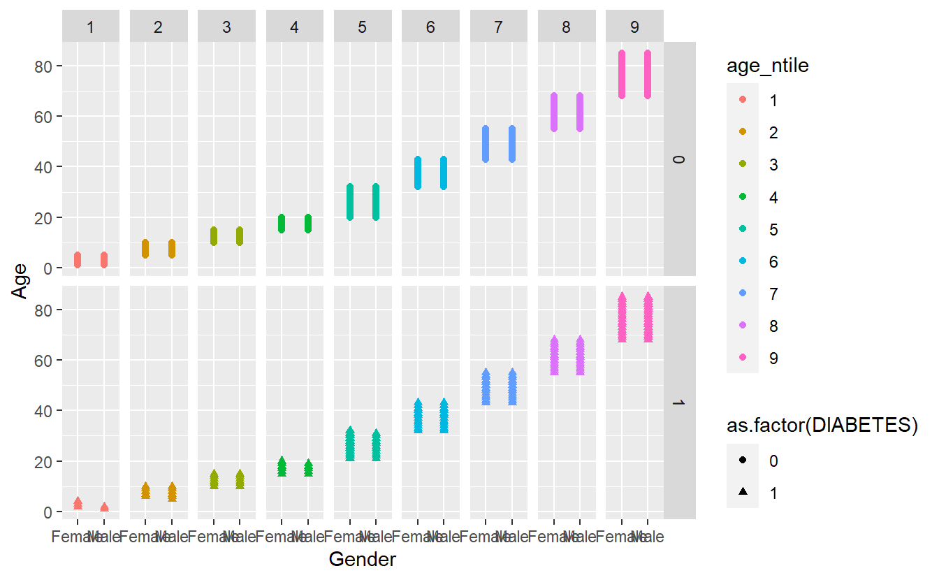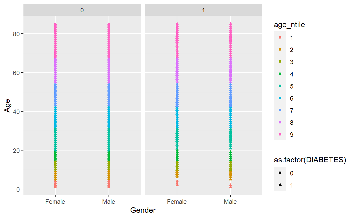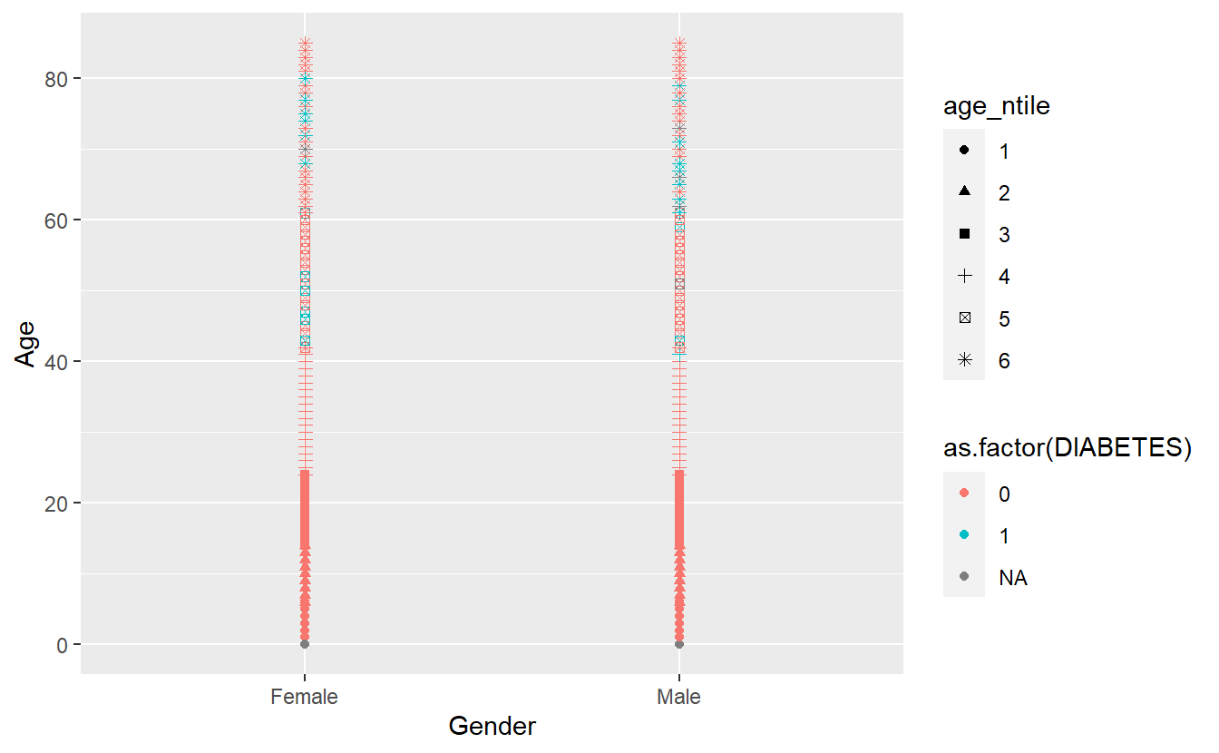 ggplot(aes(x = Gender, y = Age, color = as.factor(DIABETES), shape = age_ntile)) +