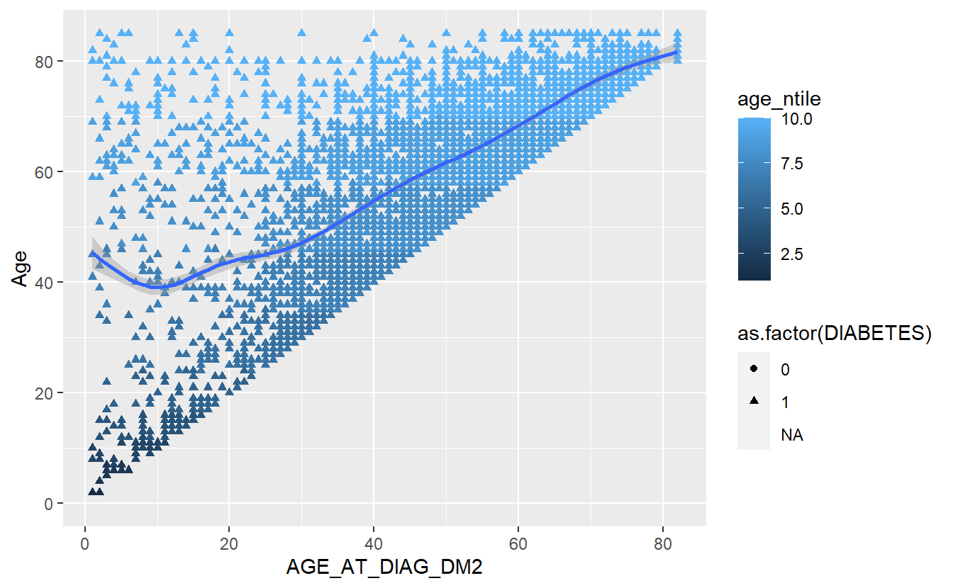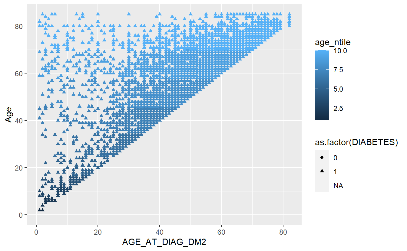 ggplot(aes(x = AGE_AT_DIAG_DM2, y = Age, shape=as.factor(DIABETES), color=age_ntile)) +