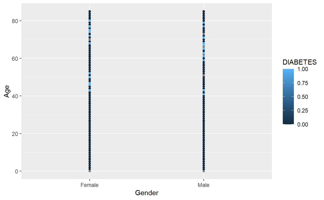 Let’s use DIABETES to give the points some color. We can do this by adding color = DIABETES inside the aes():