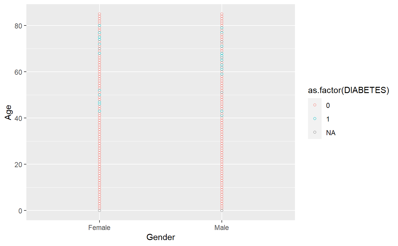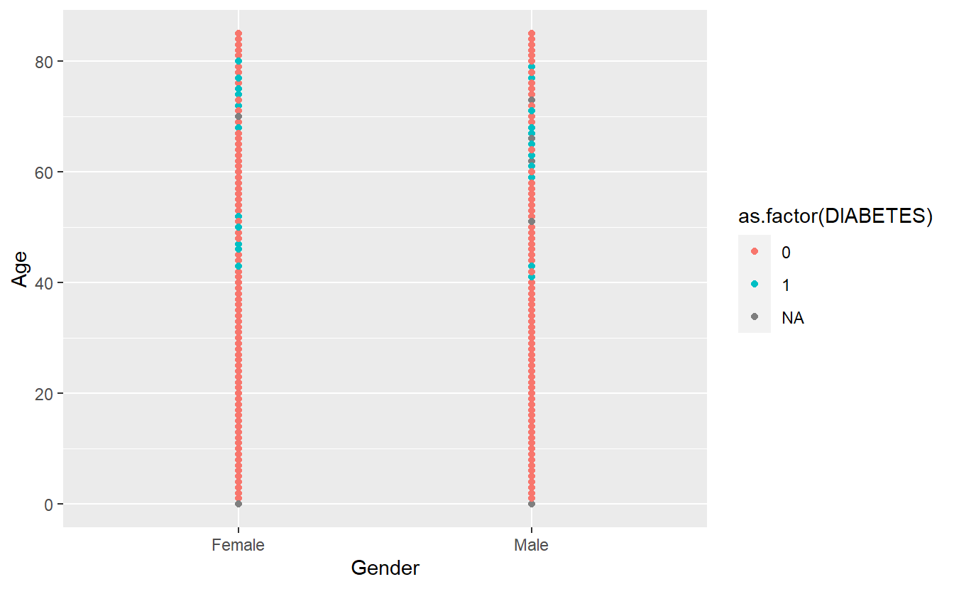 ggplot(aes(x = Gender, y = Age, color = as.factor(DIABETES))) +