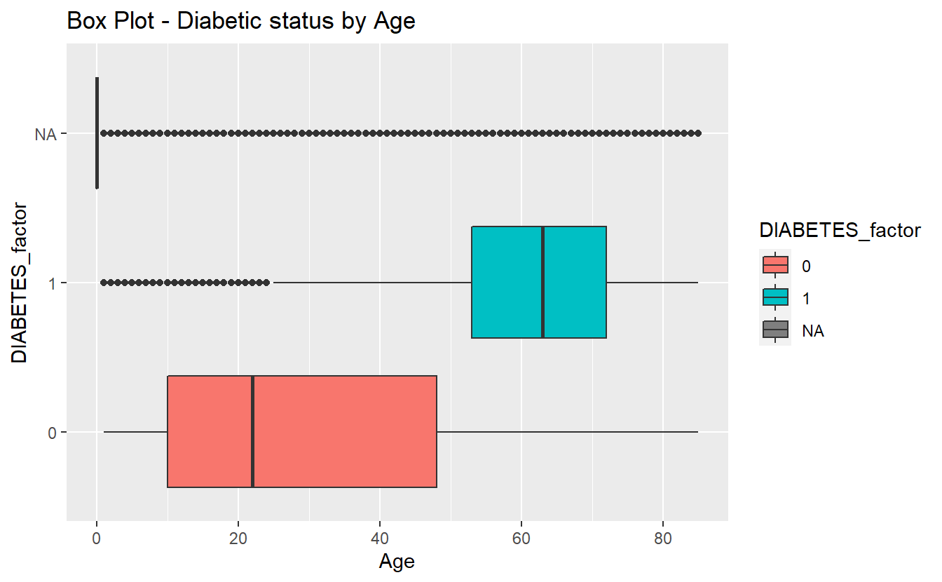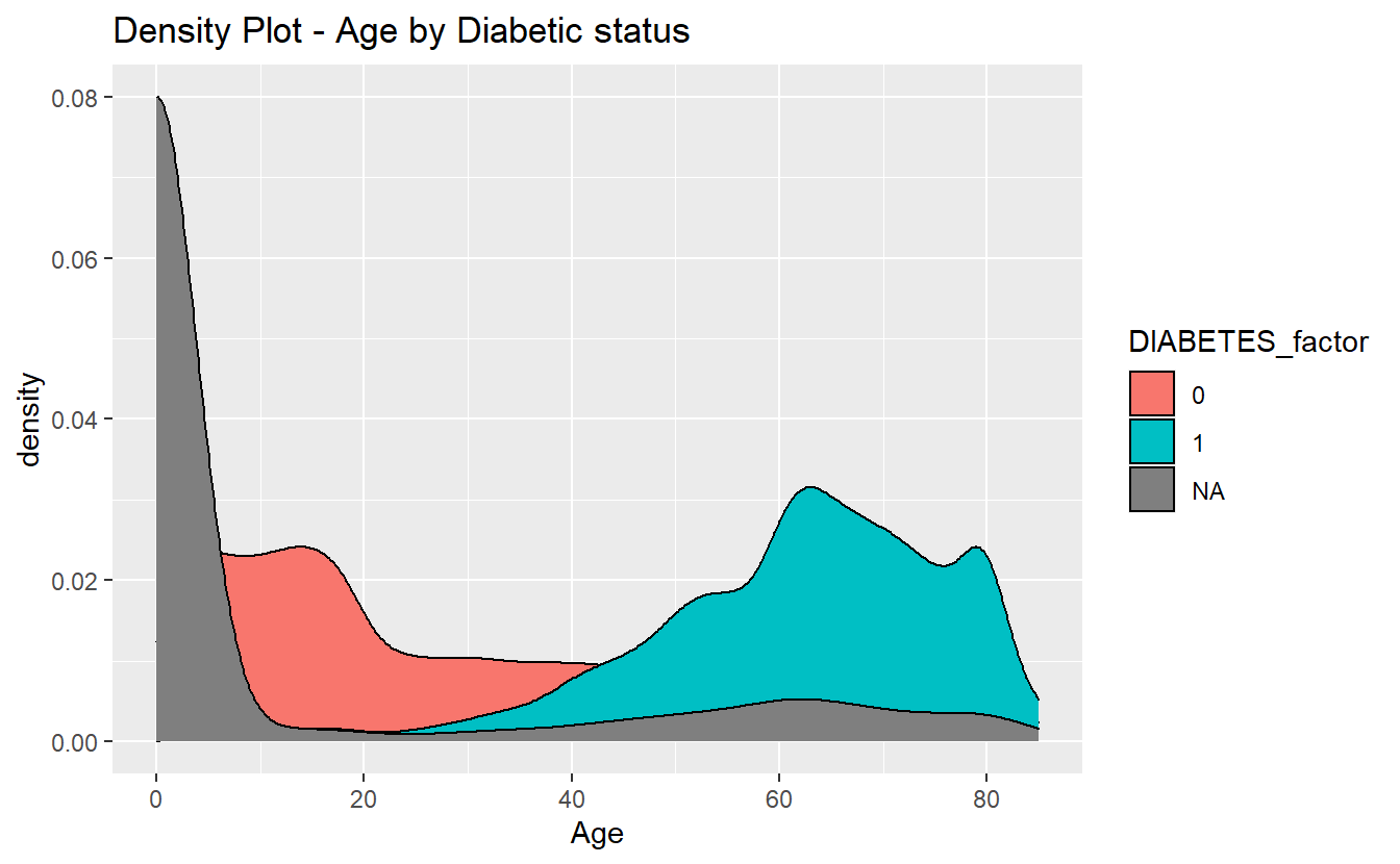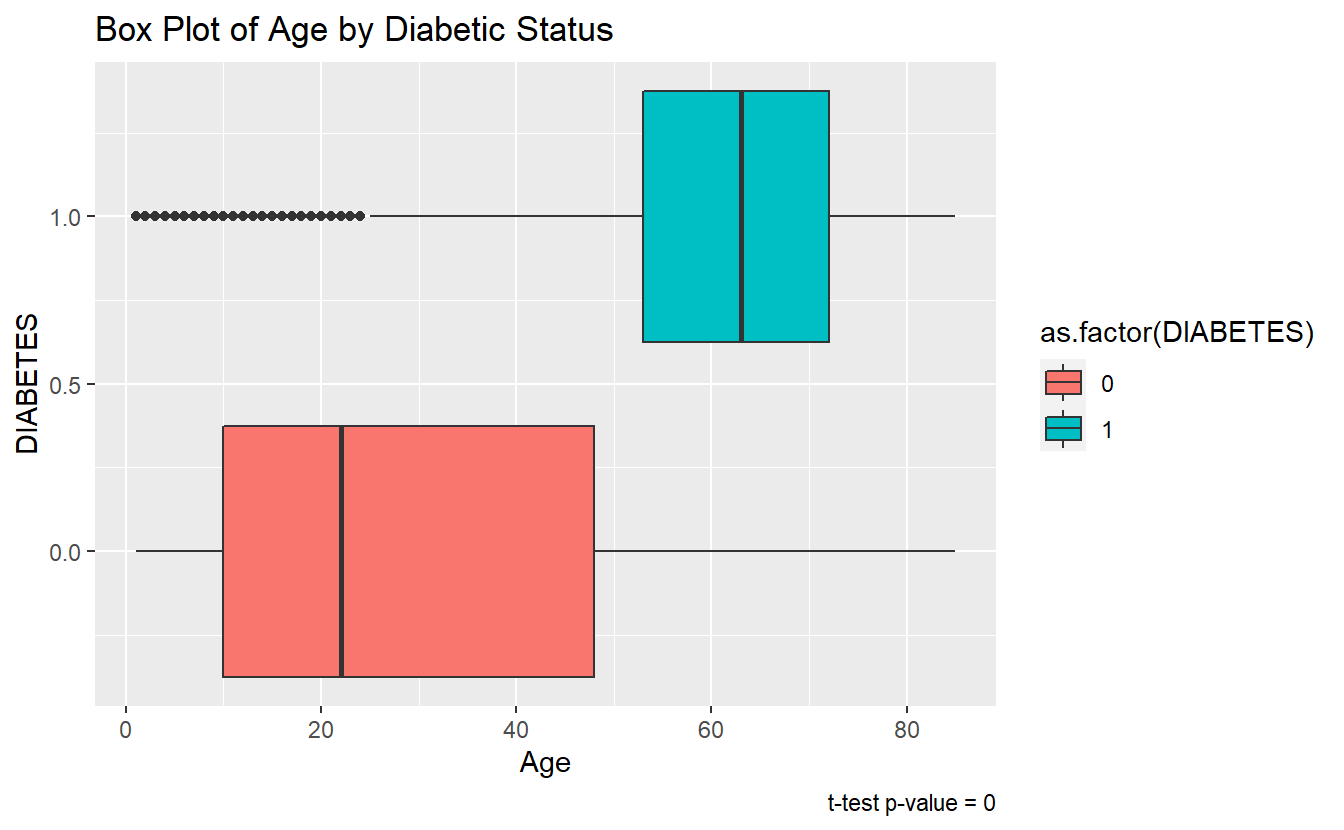 filter(is.na(DIABETES)))$AgeLet’s compare the mean ages between the Diabetic and non-Diabetic populations with the t-test: