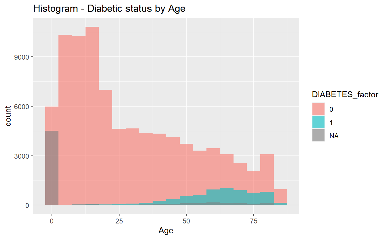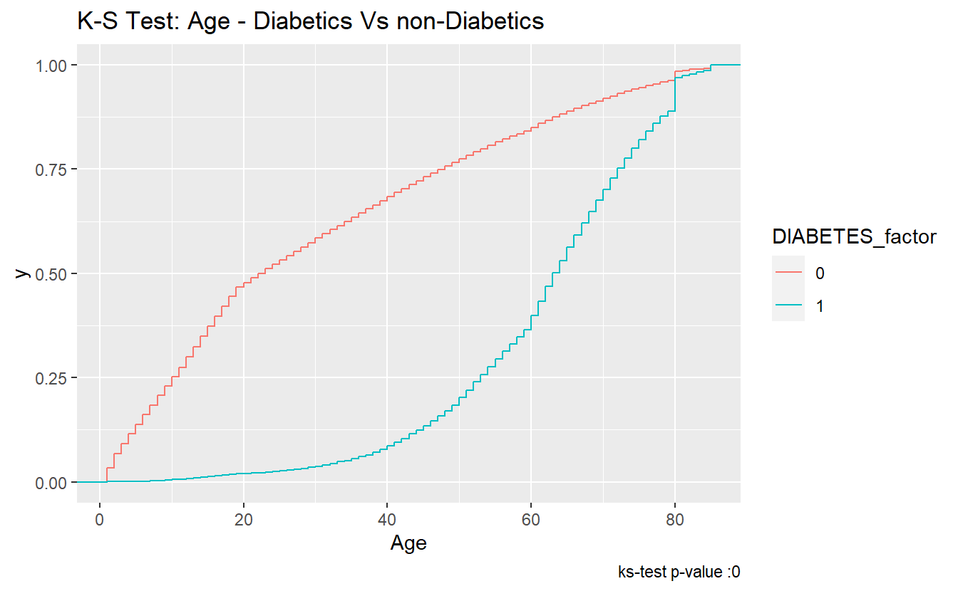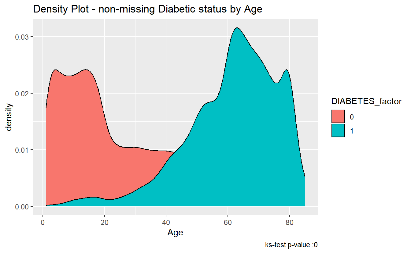 filter(is.na(DIABETES)))$AgeLet’s compare the mean ages between the Diabetic and non-Diabetic populations with the t-test: