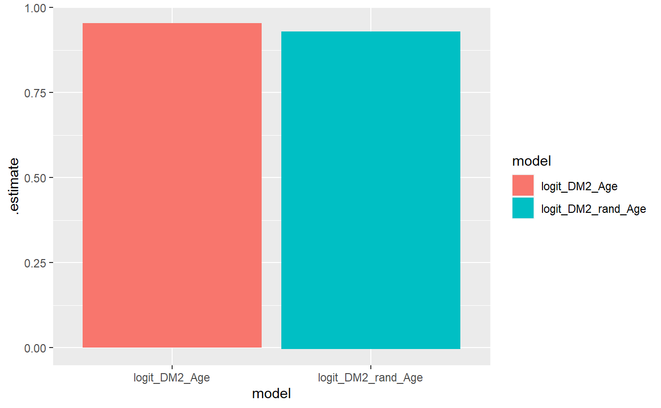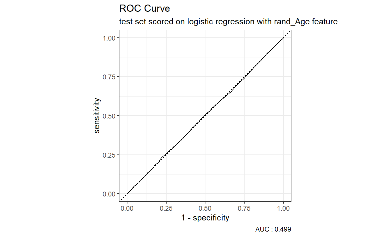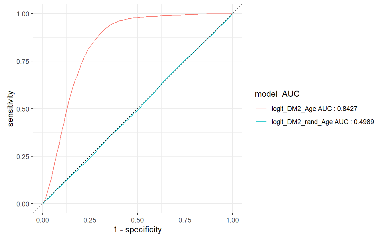 #> 2 logit_DM2_rand_Age 0.499 logit_DM2_rand_Age AUC : 0.4989Notice in the above computation that the Model_AUCs returned was a tibble we used that to create a new column model_AUC where we made some nice text that will display in the graph below: