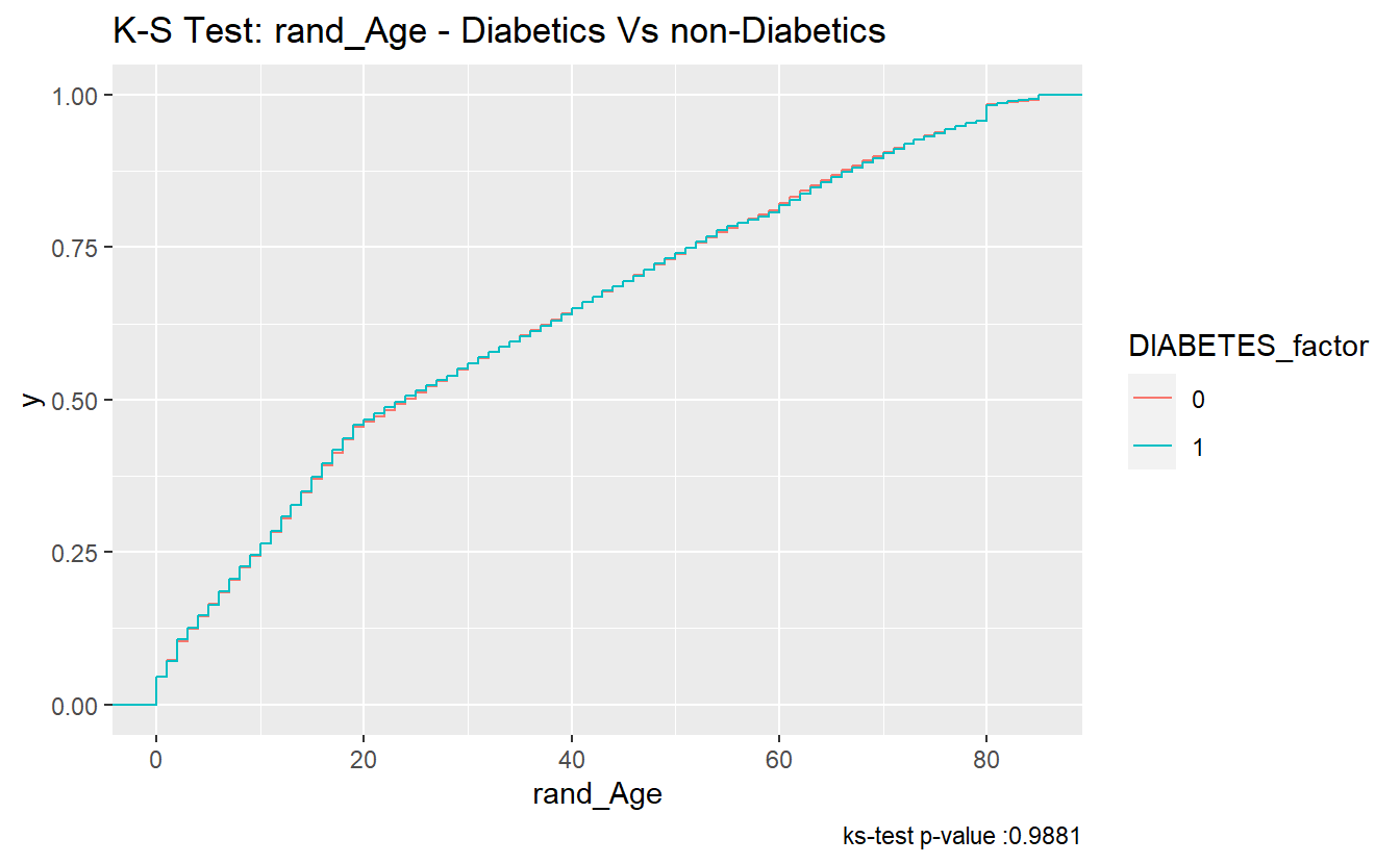 #> $ rand_Age <dbl> 18, 43, 57, 60, 7, 61, 8, 76, 0, 5, 57, 59, 32, 23, 45~Above rand_Age is defined by randomly selecting values from Age; we will show that while rand_Age and Age originate from the same distribution, that distribution is not the same across members with diabetes: