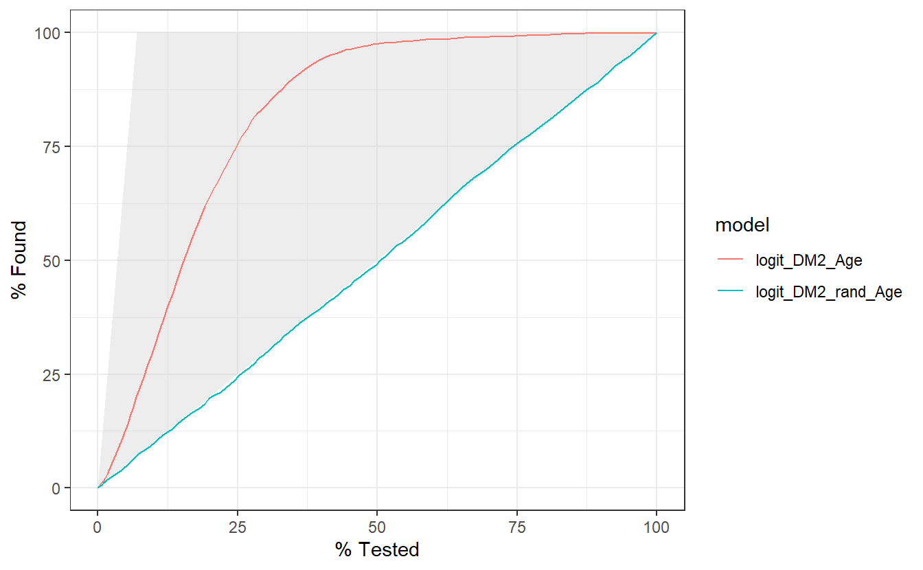 The gain curve below for instance showcases that we can review the top 25% of probabilities within the Age model and we will find 75% of the diabetic population.