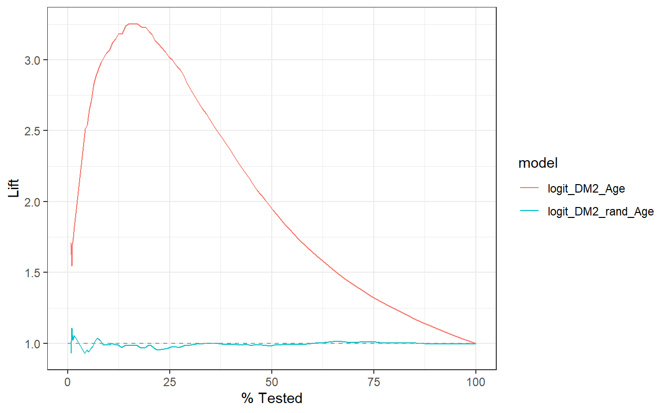 Similarly, this lift curve showcases that a review the top 25% of probabilities within the Age model and we will find 3 times more diabetics than searching at random: