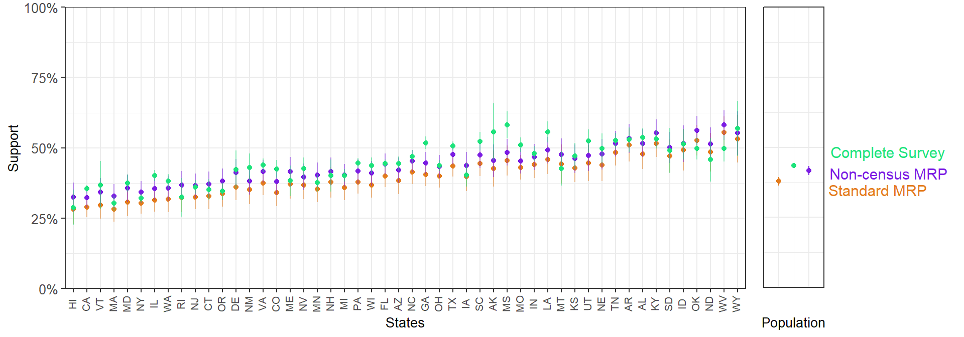Of course, we can also obtain state-level estimates and compare standard MRP with non-census MRP.