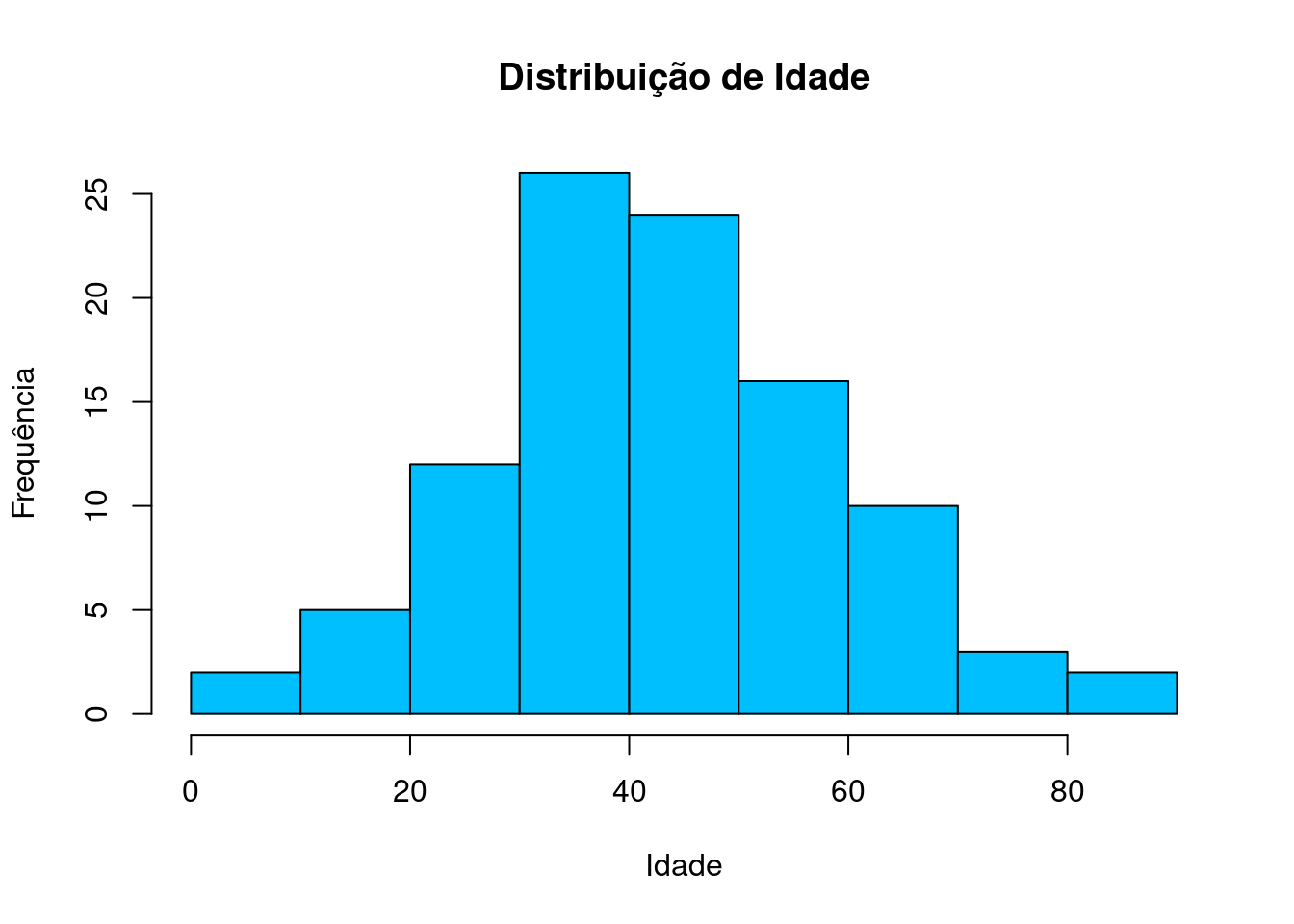 hist(dados$idade, main = "Distribuição de Idade", xlab = "Idade", ylab = "Frequência", col = "deepskyblue", border = "black")