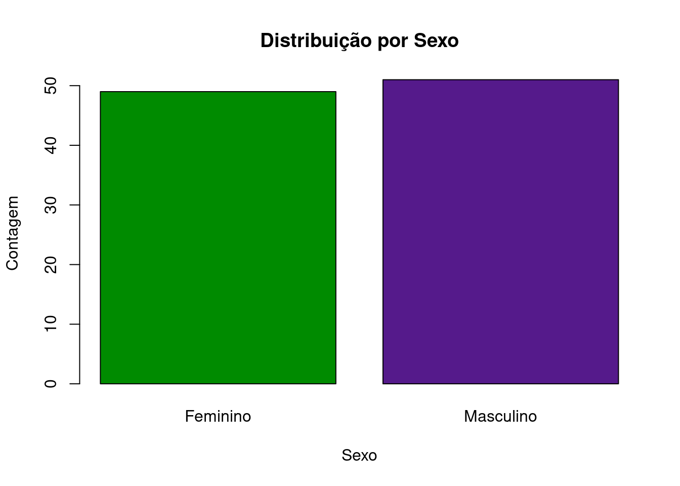 barplot(tab, main = "Distribuição por Sexo", col = c("green4", "purple4"), xlab = "Sexo", ylab = "Contagem")