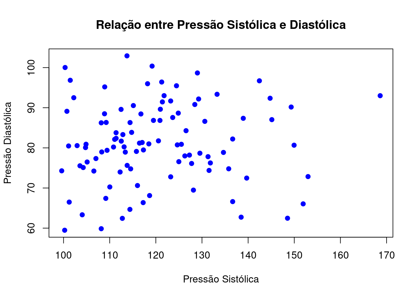 plot(dados$pressao_sistolica, dados$pressao_diastolica, main = "Relação entre Pressão Sistólica e Diastólica", xlab = "Pressão Sistólica", ylab = "Pressão Diastólica", pch = 19, col = "blue")
