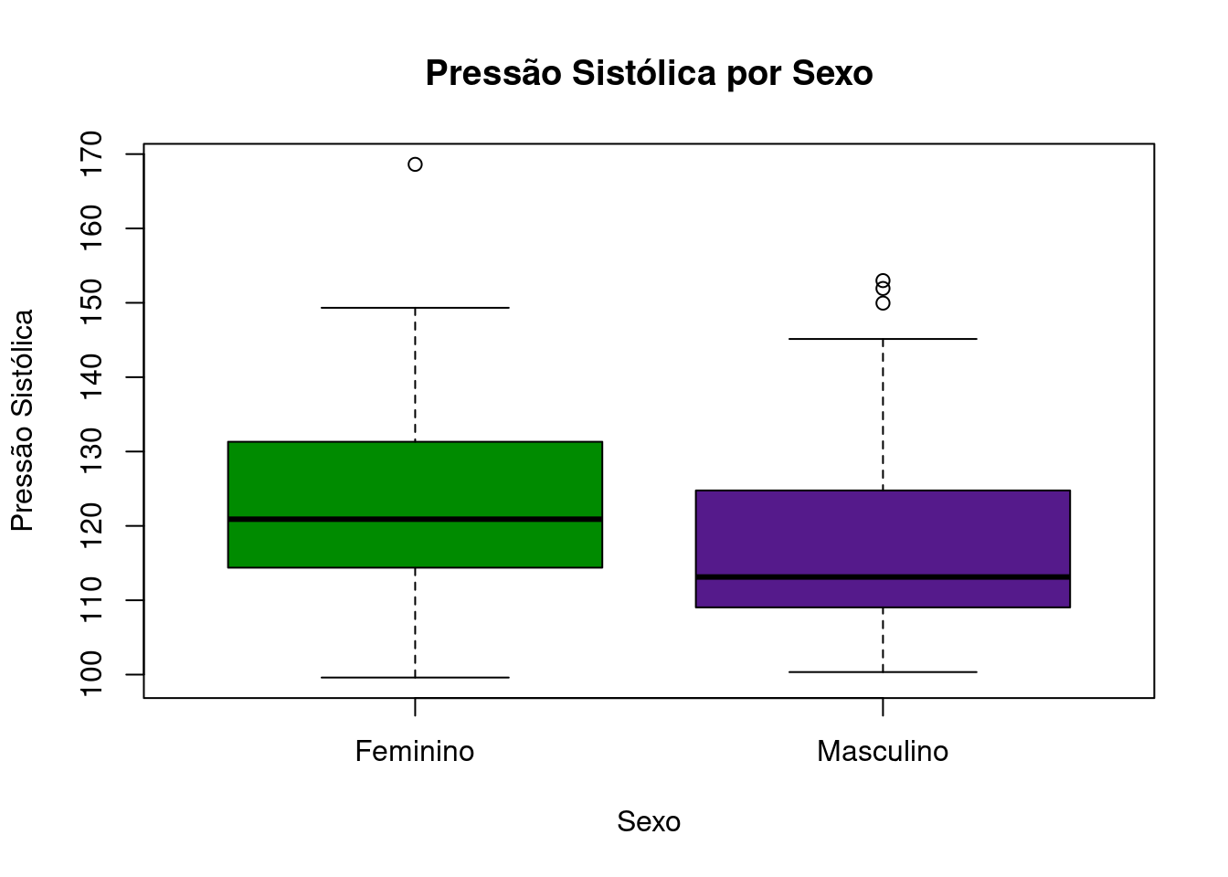boxplot(pressao_sistolica ~ sexo, data = dados, main = "Pressão Sistólica por Sexo", xlab = "Sexo", ylab = "Pressão Sistólica", col = c("green4", "purple4"))