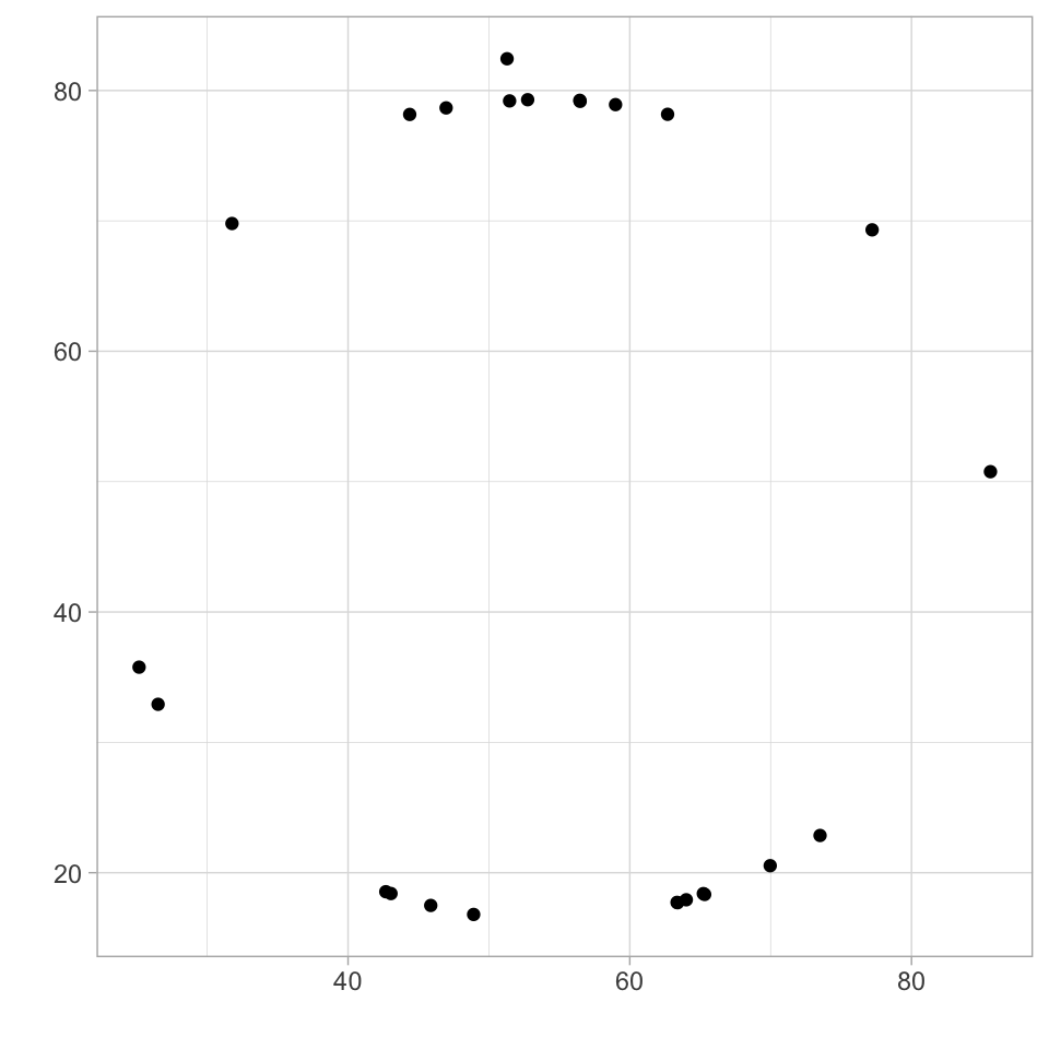 - Note: The data here comes from the datasaurus dozen. Similar to the Anscombe’s Quartet, this is a dataset that represents 13 datasets with the same summary statistics that when plotted reval different shapes.