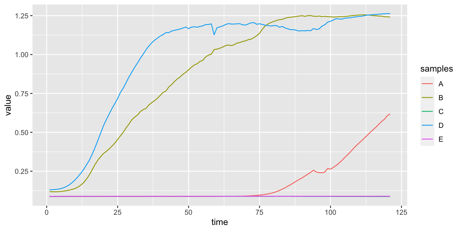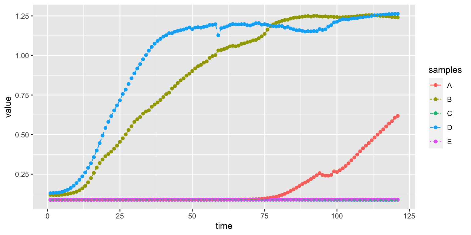 This is where ggplot comes in handy. To make plots using this library we use a special format of the table (called long format) instead of wide (like the example above). In the long format each row is a unique observation: the colony’s growth value for a sample at a specific time.