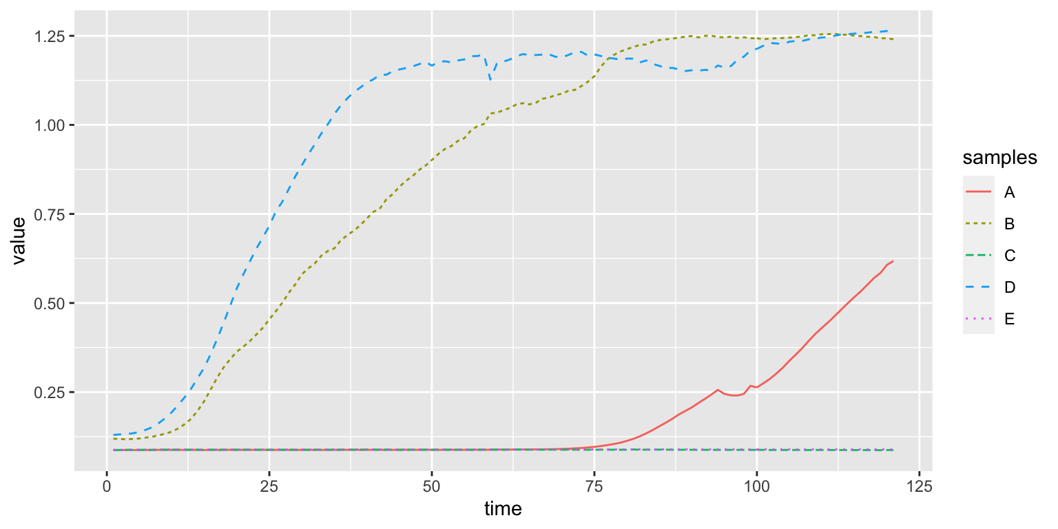 We can also select a different type of line with aes(lty=samples)