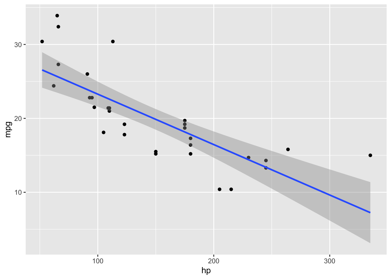 What if we wanted to see the effects of having a higher horsepower (hp) car on the car’s miles-per-gallon (mpg)? We can use a linear regression (with a pipe, because why not?):