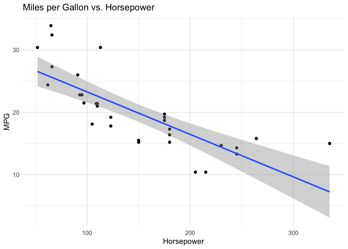 labs(x = "Horsepower", y = "MPG", title = "Miles per Gallon vs. Horsepower") +