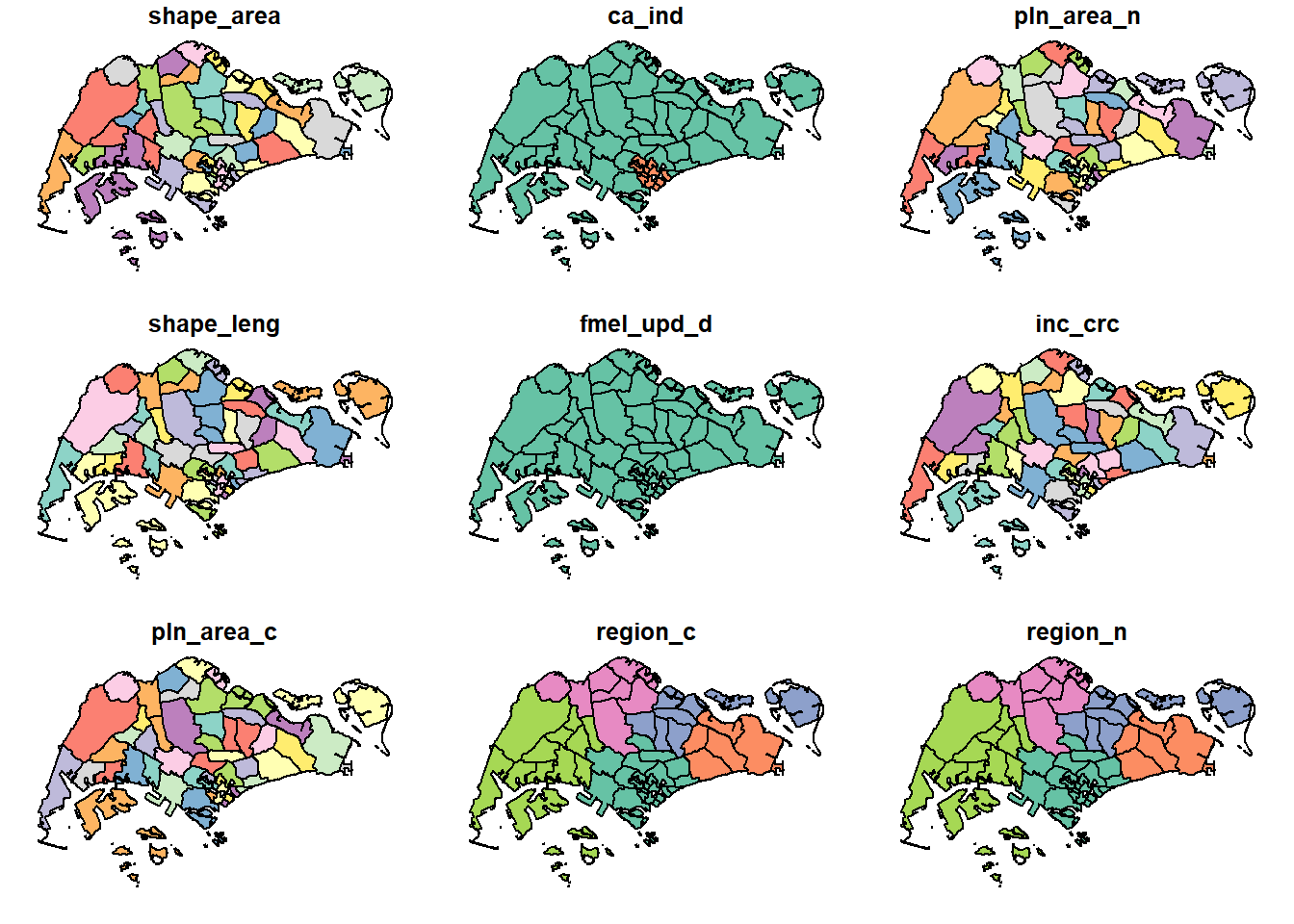 geojson_sf()plot(planning_areas)## Warning: plotting the first 9 out of 10 attributes; use max.plot = 10 to