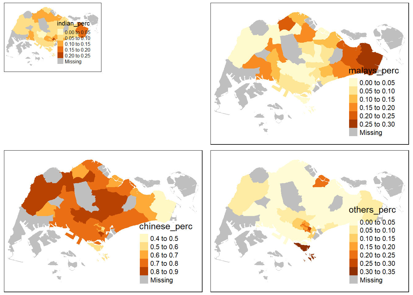 tmap_arrange(indian, malays, chinese, others, ncol = NA, nrow = NA, sync = FALSE, asp = 0,