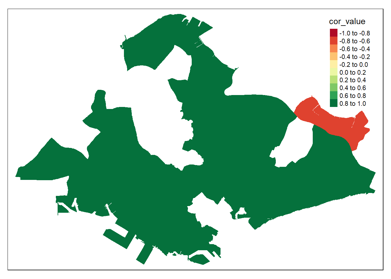 tm_fill("cor_value", breaks = c(-1, -0.8, -0.6, -0.4, -0.2, 0, 0.2, 0.4, 0.6, 0.8, 1))## Variable "cor_value" contains positive and negative values, so midpoint is set to 0. Set midpoint = NA to show the full spectrum of the color palette.