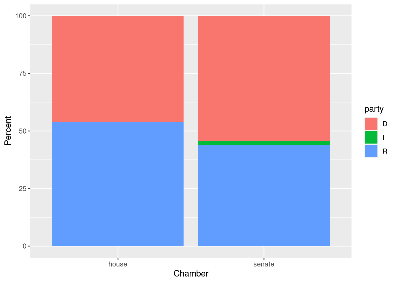 ggplot(data=ds, mapping=aes(x=chamber,y=pct,fill=party)) +
