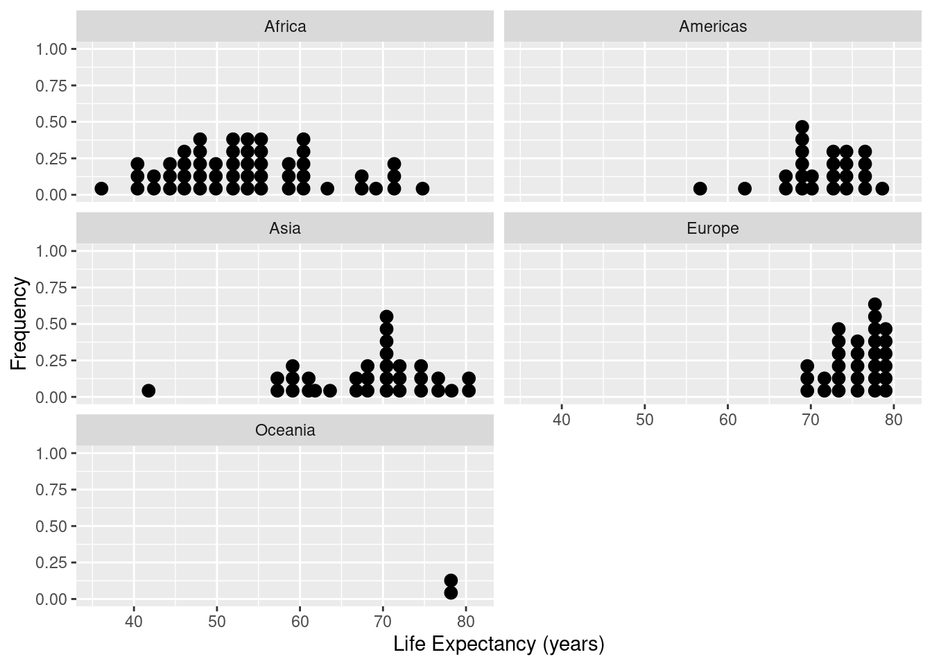 | lifeExp | Africa | 0 | 1 | 53.59827 | 9.103387 | 36.0870 | 47.30025 | 52.759 | 59.22850 | 74.772 |