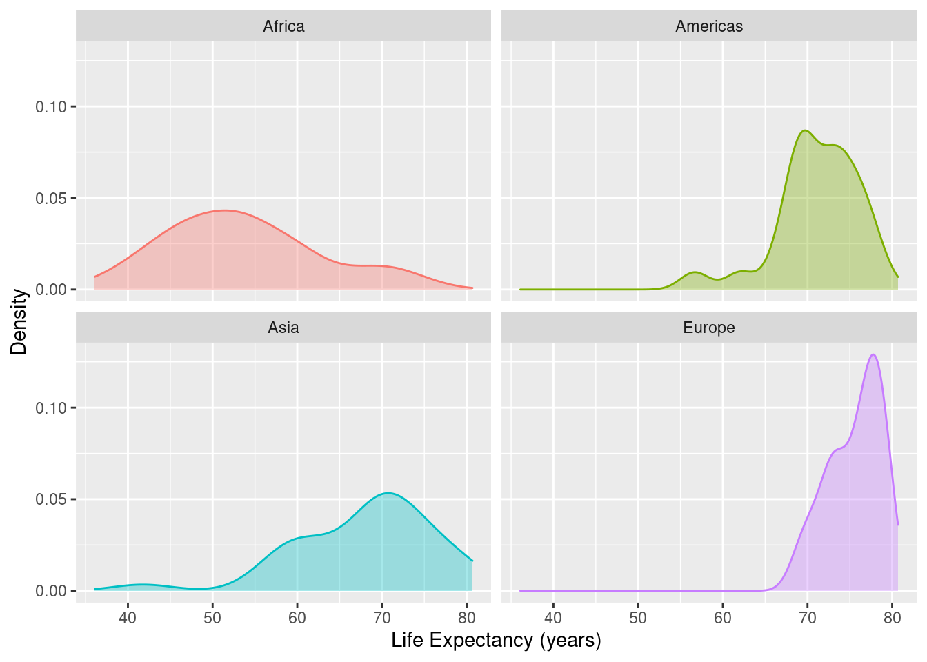 The code given here shows how to produce a density plot in separate panels for each continent.