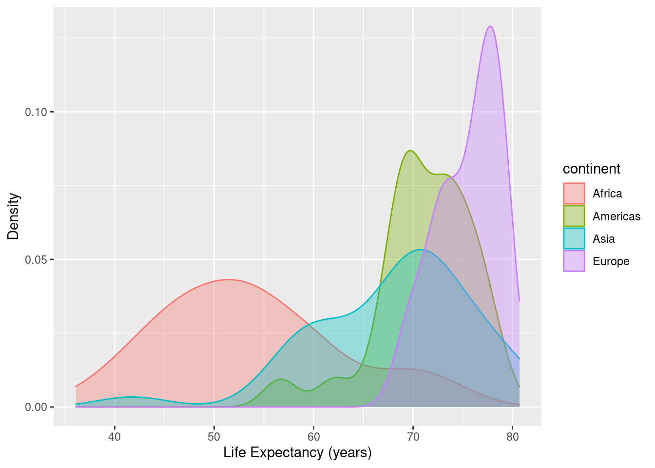 ggplot(data=., mapping=aes(x=lifeExp, colour=continent, fill=continent)) +