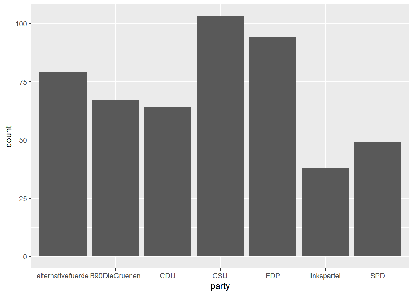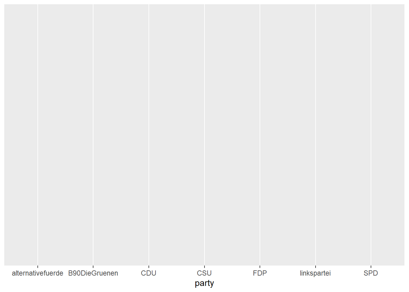 Um etwa ein einfaches Säulendiagramm für die Anzahl der Posts pro Partei zu erstellen, definieren wir party als x-Aesthetic und fügen ein geom_bar() hinzu: