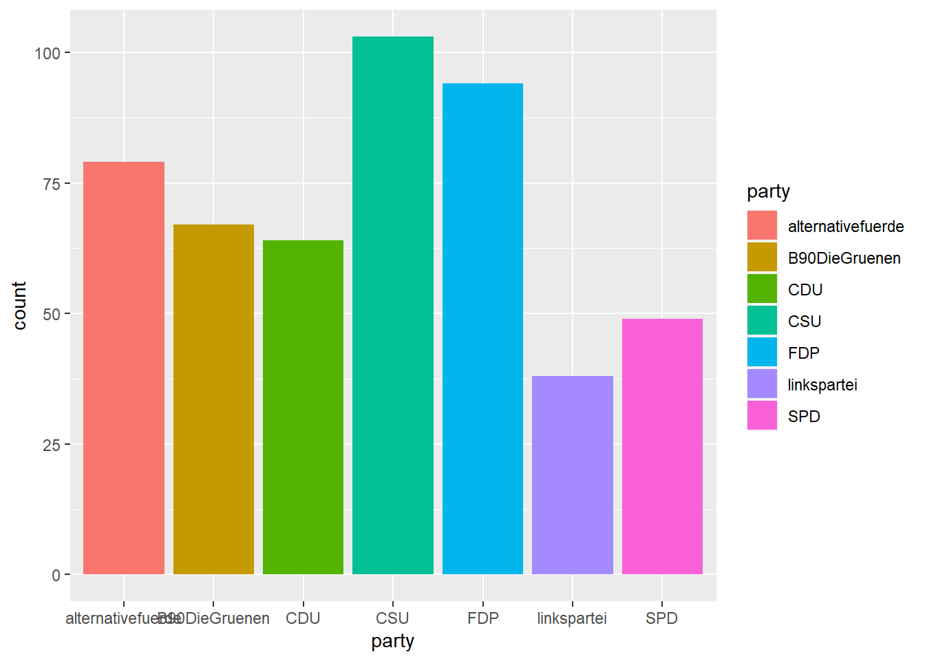 Um beispielsweise die Partei (Variable party im Datensatz) auf der X-Achse zu kodieren, geben wir an: