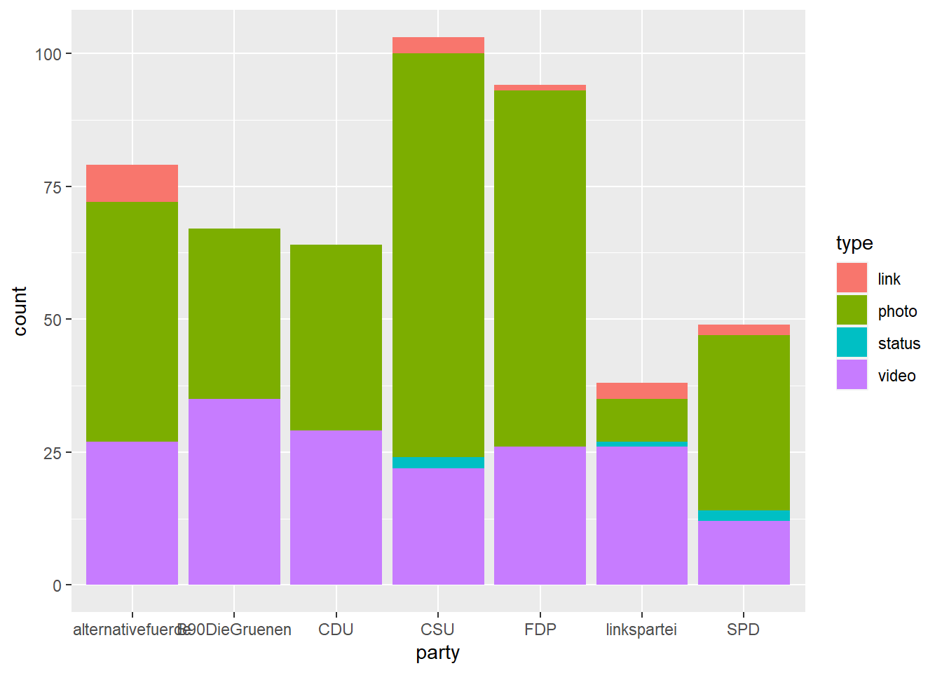 Und schon haben wir die Y-Achse angepasst. Weiter geht es mit der X-Achse. Hierbei handelt es sich um kategoriale, also auch diskrete Werte, die zugehörige Skalenfunktion ist also scale_x_discrete(). Auch hier übergeben wir einen neuen Namen und geben die Ausprägungen in der gewünschten Reihenfolge per limits an. Zudem passen wir mittels labels die Beschriftungen für die drei Facebook-Seiten alternativefuerde, linkspartei und B90DieGruenen" an: