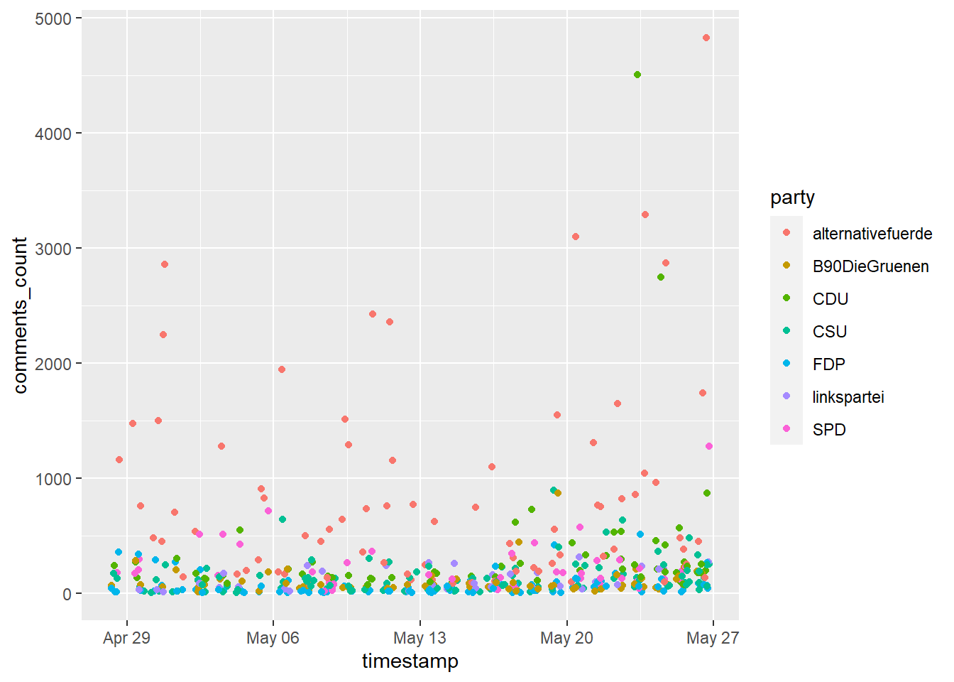 Möchten wir stattdessen die Anzahl der Kommentare (Variable comments_count) im Zeitverlauf (Variable timestamp) und farblich getrennt nach Parteien (Variable party) zeigen, definieren wir die Aesthetics wie folgt: