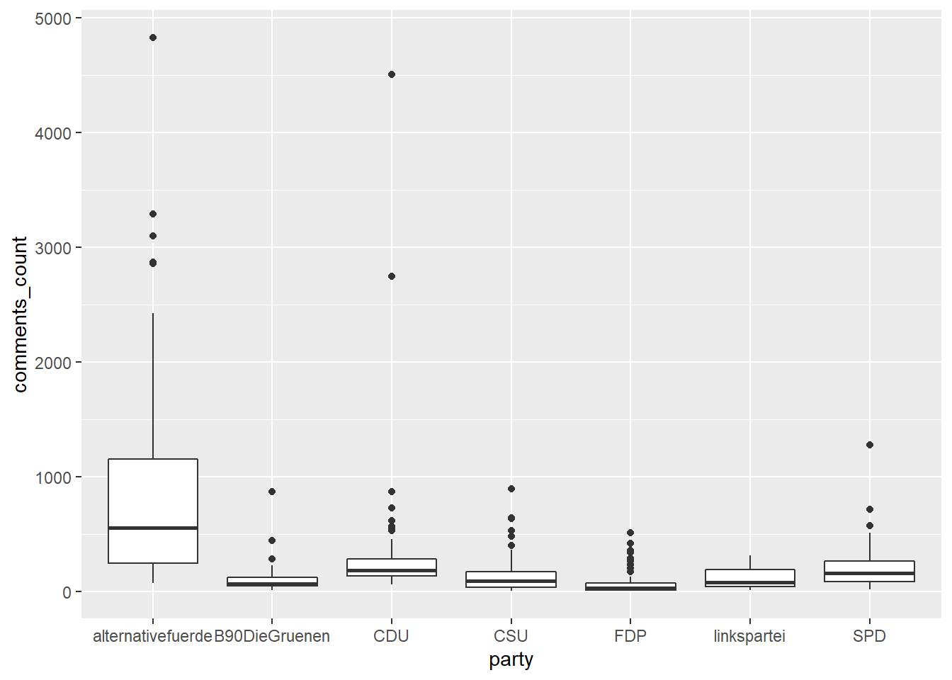 Oder wir stellen je Partei die Verteilung der Kommentaranzahl als Boxplot dar: