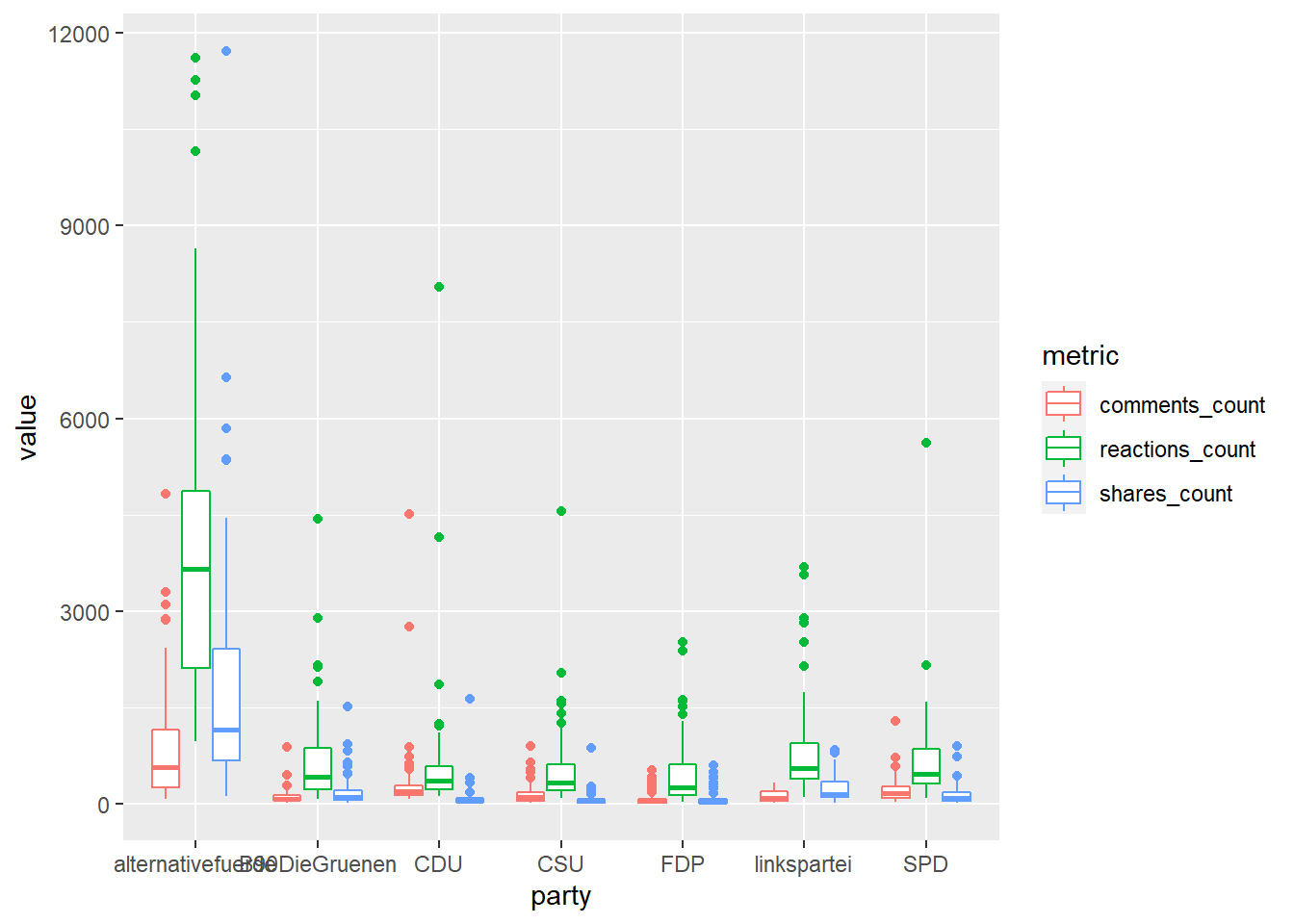 Und schon können wir die Verteilung der Facebook-Metriken in Abhängigkeit von Partei und Art der Metrik darstellen – etwa indem wir party in x, value in y und metric in color kodieren und dann pro Partei verschiedenenfarbige Boxplots plotten: